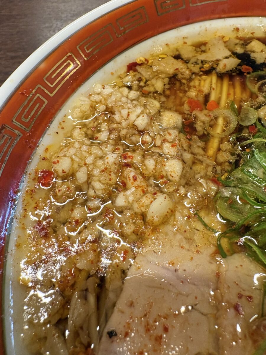 ニンニクもりもり&鶏と豚のスープに醤油でガツンと来る一杯で、特にラー油とも合わさって良い香りになっています。