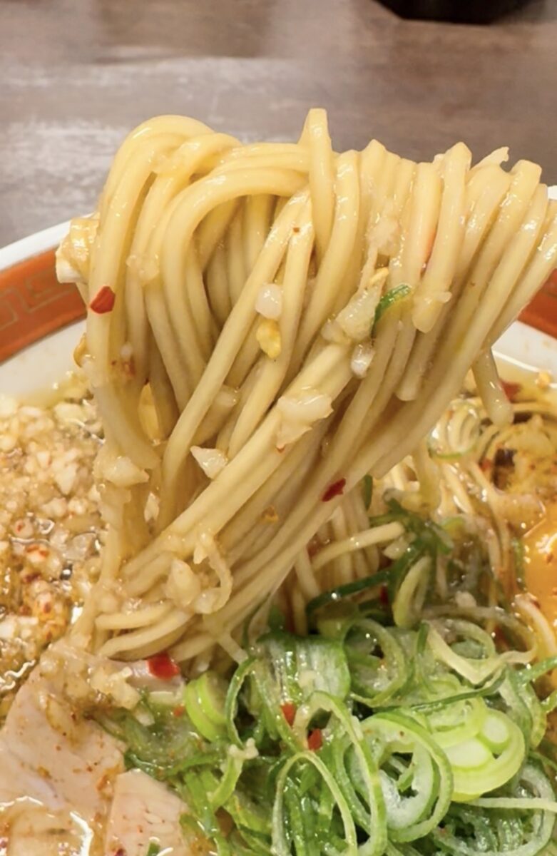 細麺かつ少しだけボリューミーな麺に絡めて食べると、二郎的なにんにくのパンチがやみつきになる〜!