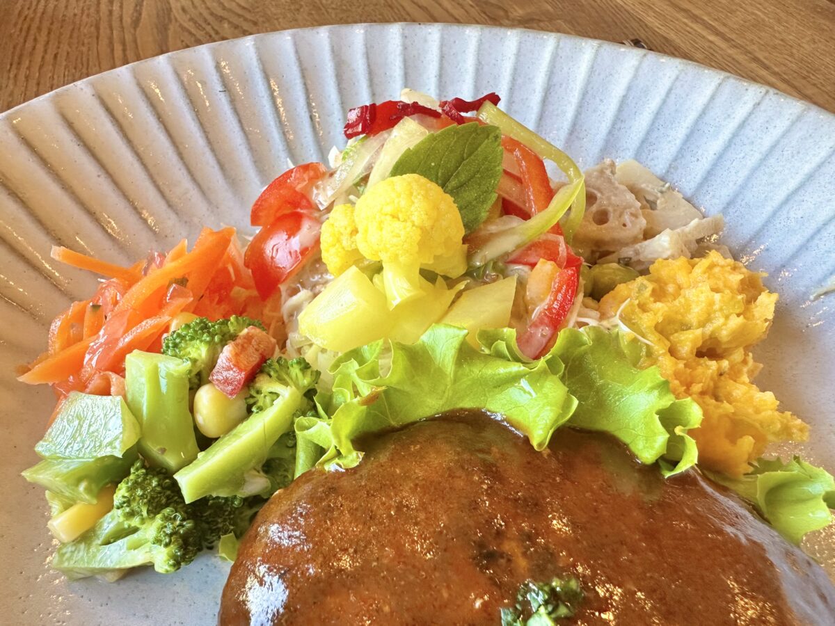キラリと輝くハンバーグに、カラフルな彩りのサラダ。