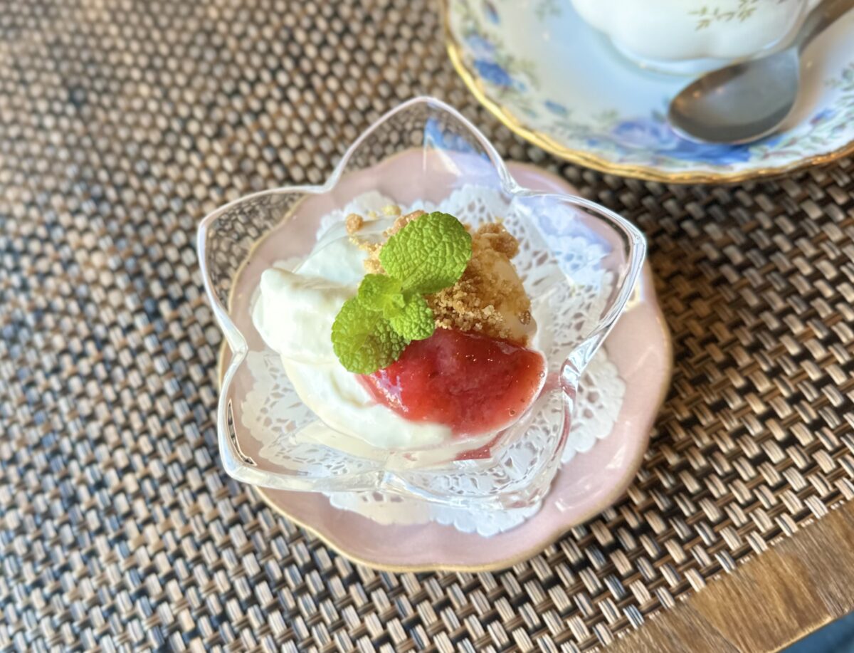 爽やかな酸味と甘みのレアチーズケーキストロベリーソース。