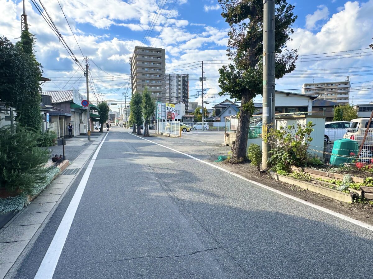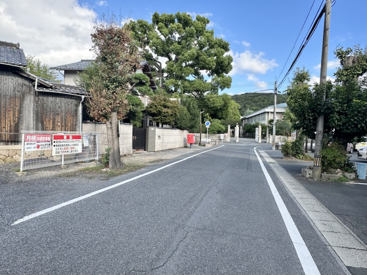 お店から左を見ると、朝日高校の校門がすぐ近く。
