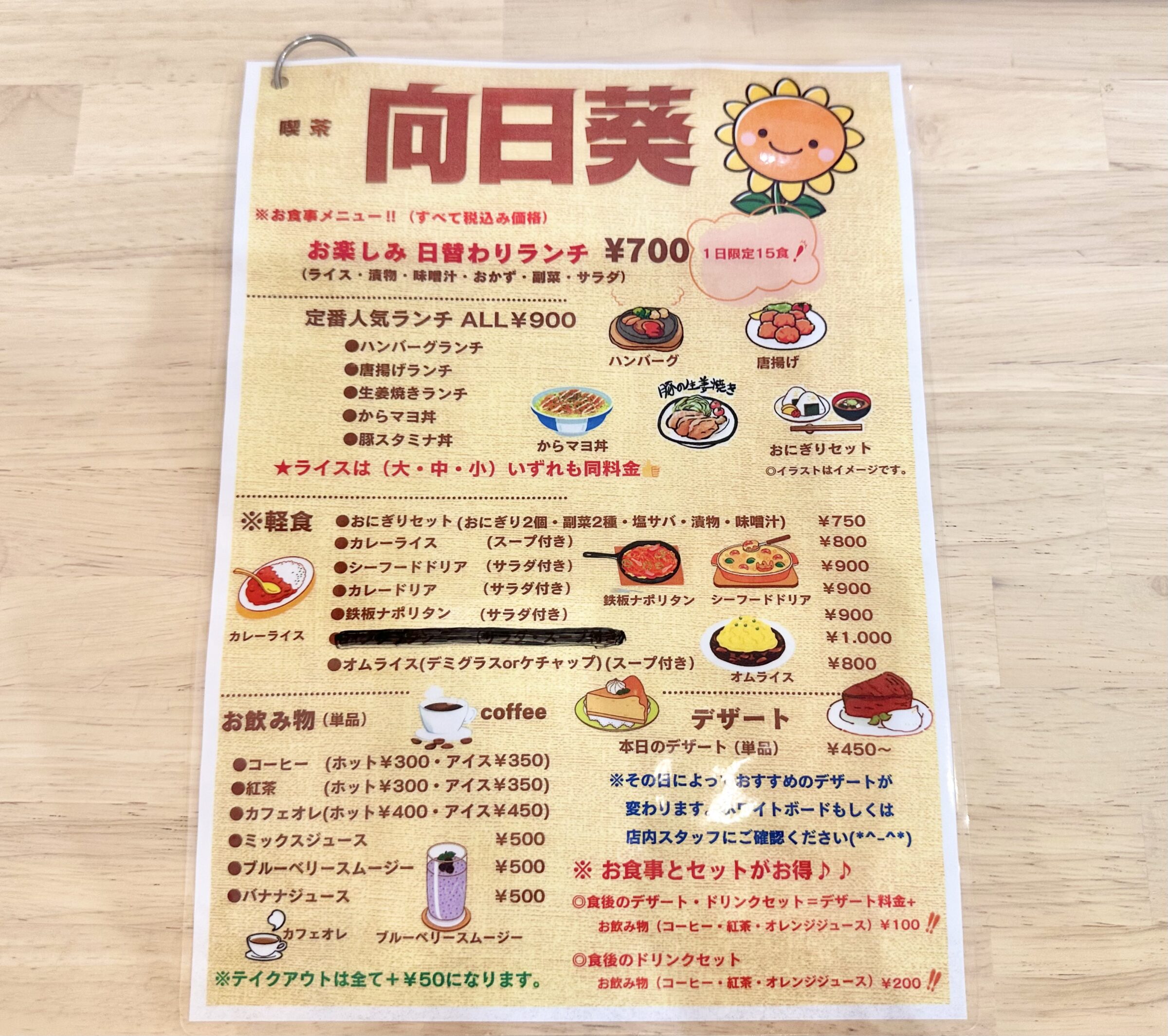「喫茶向日葵」さんは、安くてボリューミーで味も評判の定食、それに軽食やデザートメニューもあって、この日もたくさんのお客さんが訪れていた人気店。