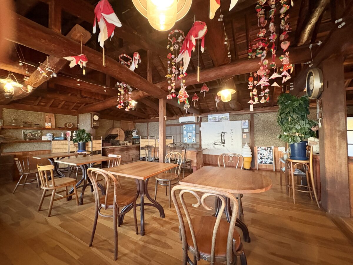 カフェスペース内も古民家ならではの大きな梁や柳井の金魚ちょうちんが吊るされていておしゃれな見ていて飽きない空間です。
