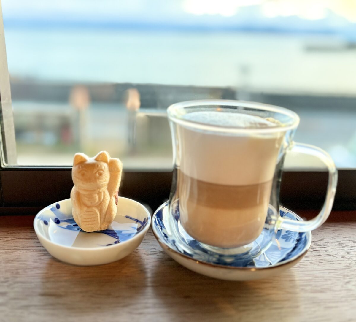頼んでみたのはカフェラテと招き猫もなかです!