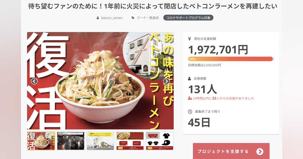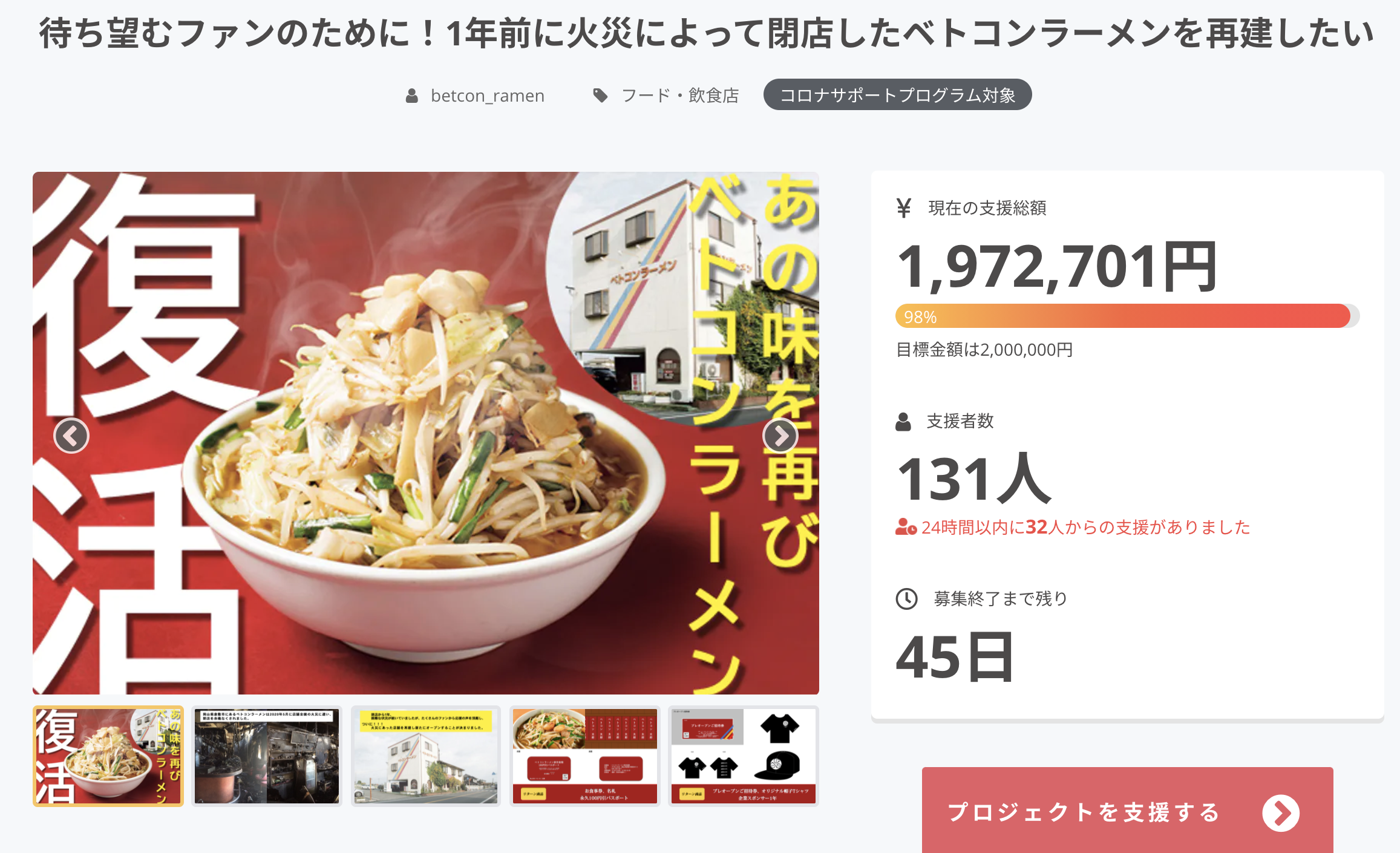 また、その営業再開に向けての資金をクラウドファンディングで募集したところ、目標額200万円の150%の300万円が現在集まっています。