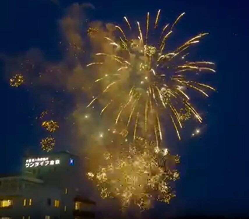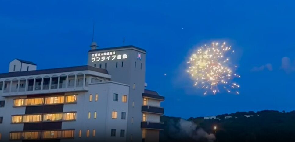 「第26回水清会グループひまわり祭」の花火で、会場が介護老人保健施設サンライフ倉敷。