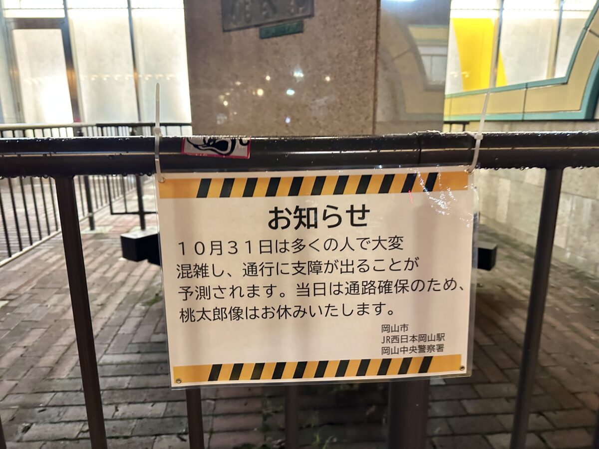 毎年10月31日、岡山駅前交通広場は多くの人で大変混雑しています。また、当広場は現在工事中のため、通路が狭くなっています。当広場を利用される際は、滞留することなく、通路の確保にご協力ください。