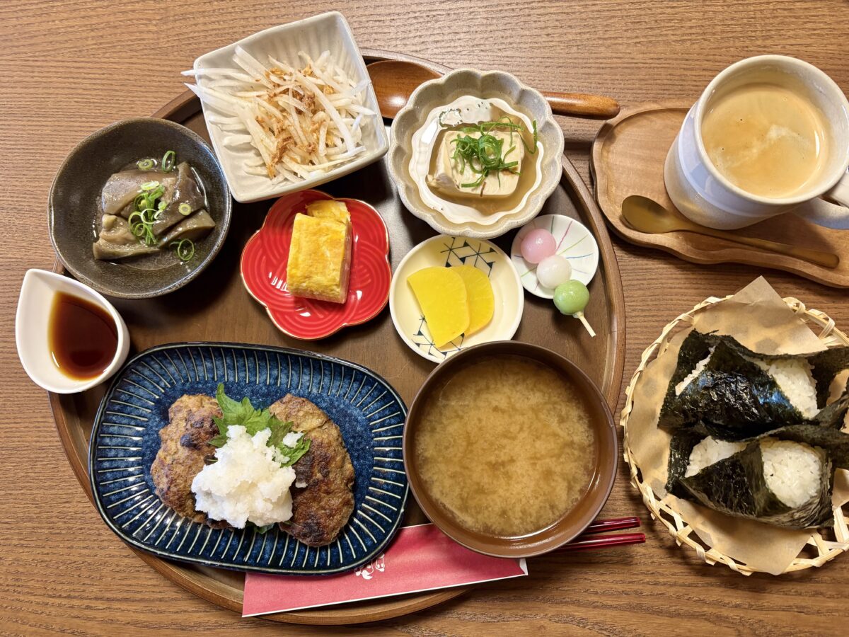 この日はおろしハンバーグかからあげが選べて、それに塩むすびと副菜4種にお味噌汁、漬物、お飲み物が付きます。