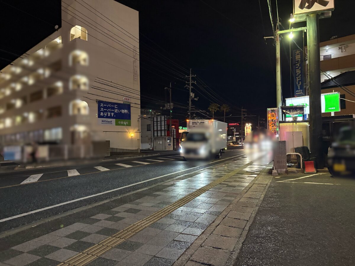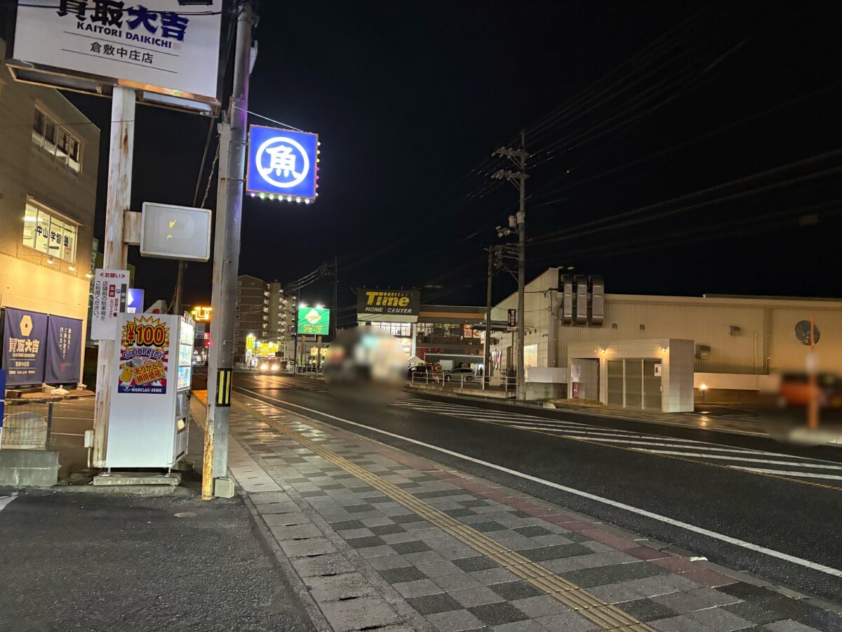 左を見ると「生鮮&業務スーパー エブリイ 中庄店」、「ホームセンタータイム中庄店」などある旧2号線沿い。
