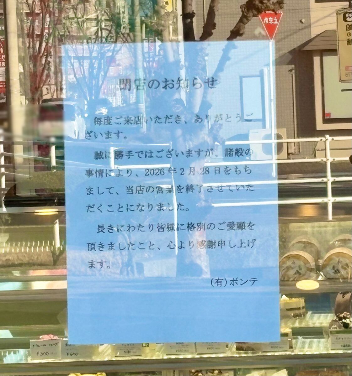 玉島の産業通り沿いにある「洋菓子店ボンテ」さんが2月28日で閉店するようです。