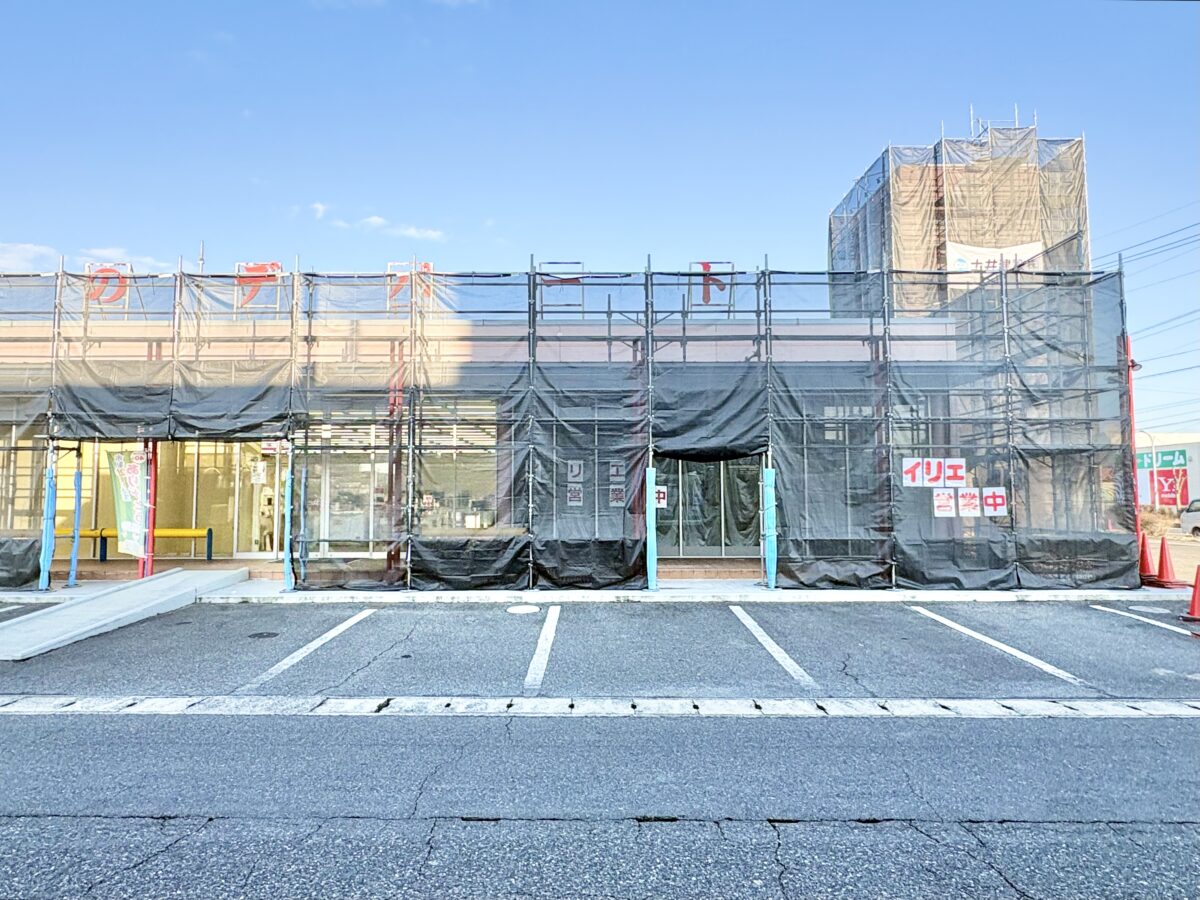 住所としては「ギフトランドイリエ岡山総社店」のところで、「イリエ営業中」とありますが道沿いの看板と店舗スペースが工事中になっていました。