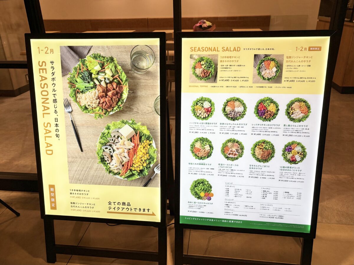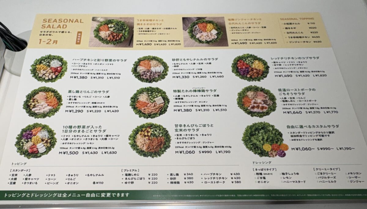 8種類のスタンダードサラダと自由にセレクトができるカスタムサラダ、それから2種類の季節限定サラダがあります。