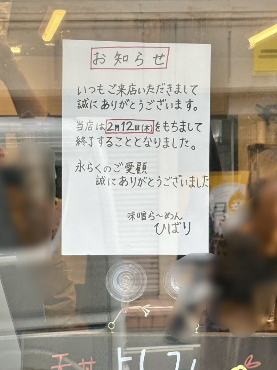 それから味噌らーめんひばりさんは業態変化のため2月12日閉店。