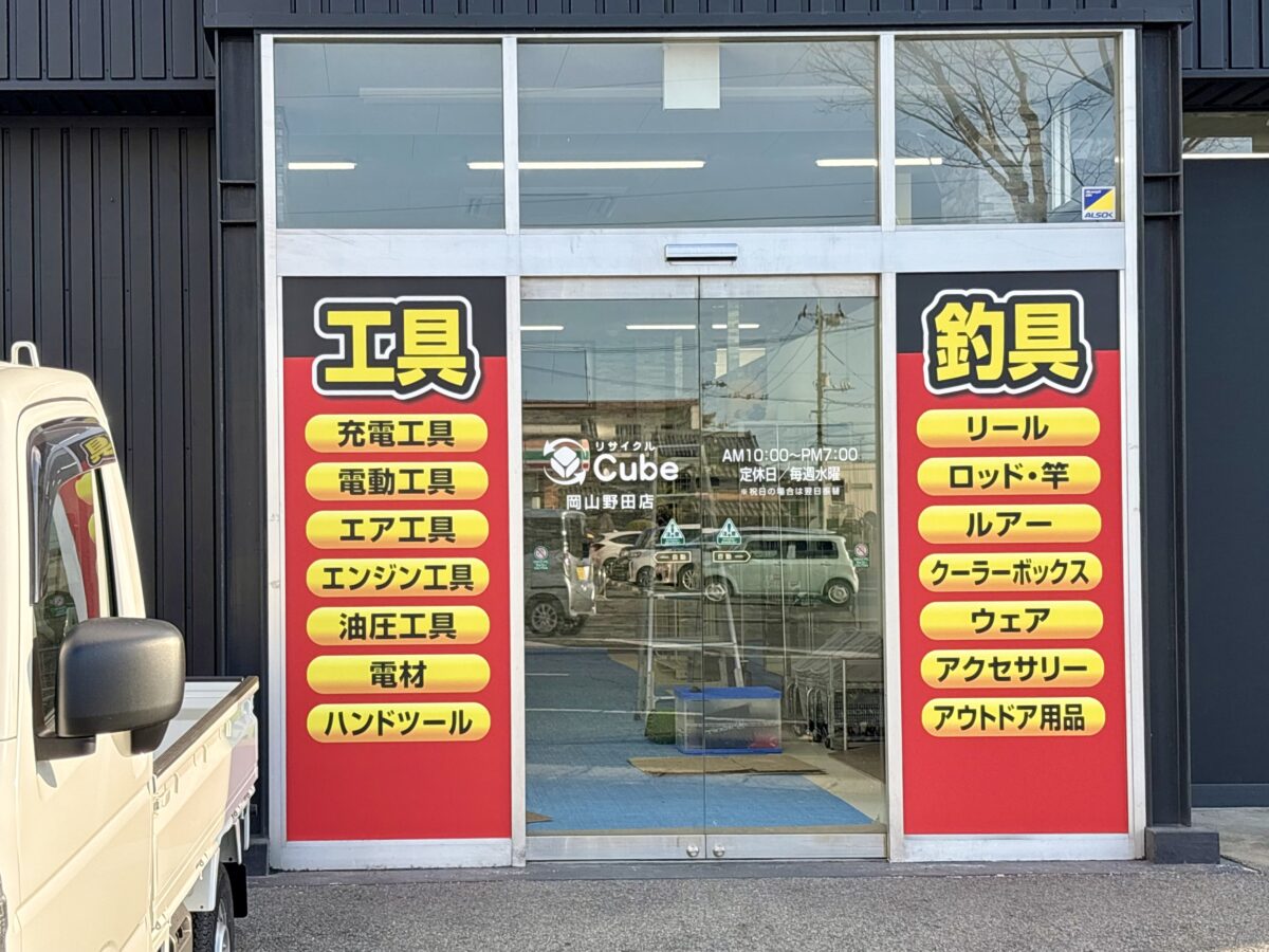「リサイクルCube岡山野田店」で調べてみると、工具・釣具の買取に力を入れ、中古販売も行うリサイクルショップとありました。