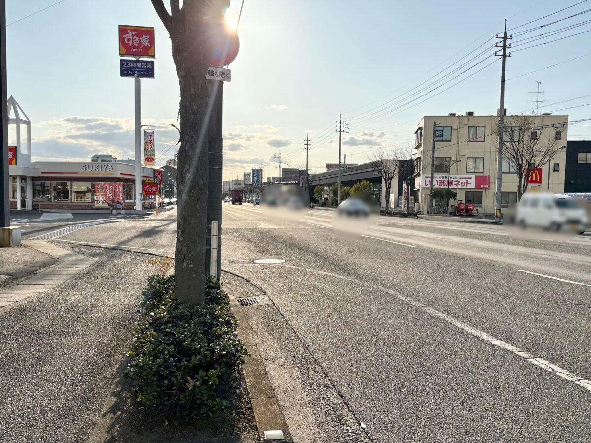 左を見ると最近リニューアルした「すき家 岡山野田店」、岡山ホーム方面で向かいに「マクドナルド 岡山野田店」、「セブン-イレブン 岡山野田4丁目店」があります。