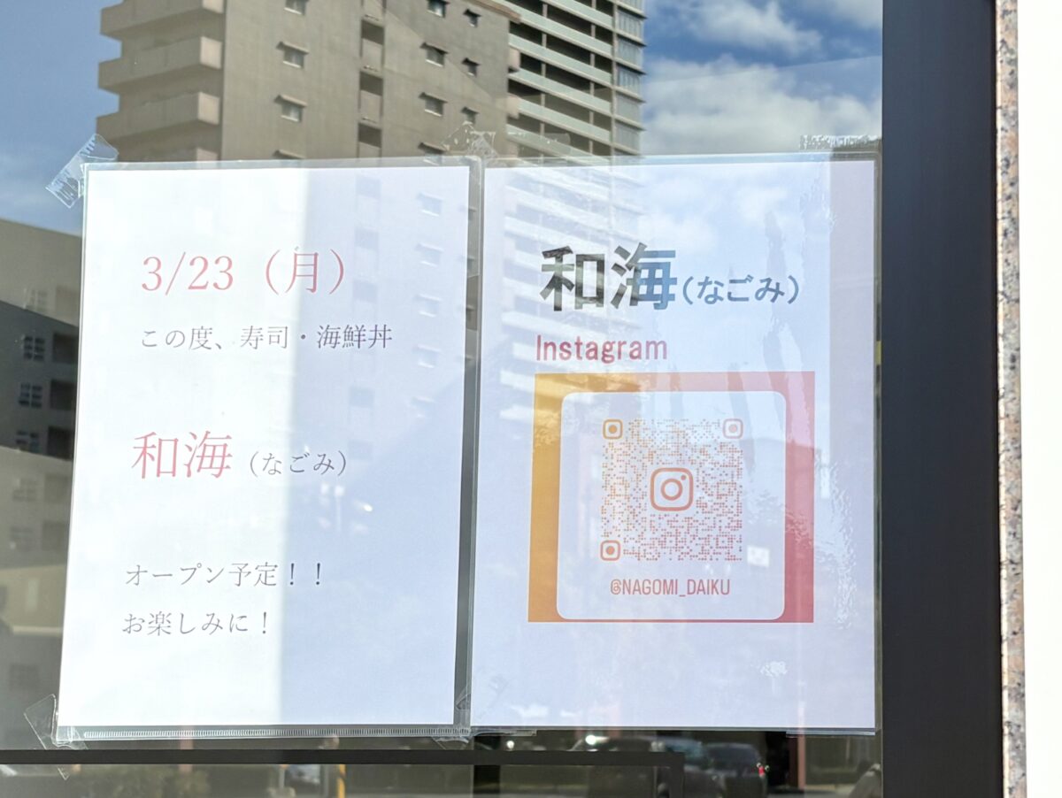 大供交差点のちかくに「寿司屋 和海(なごみ)」さんという寿司と海鮮丼のお店ができるようです。