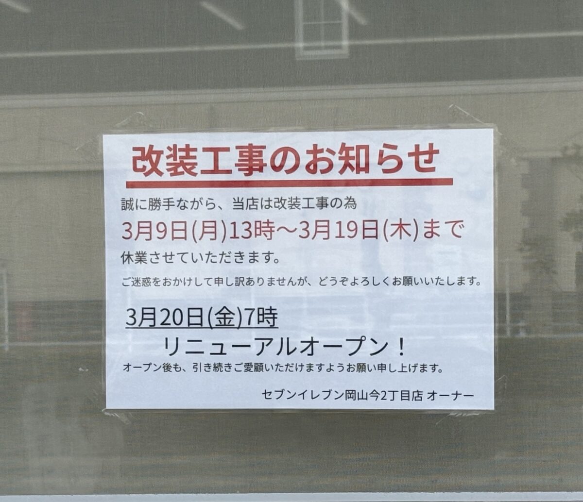 「セブンイレブン岡山今2丁目店」が新しくなっていました。