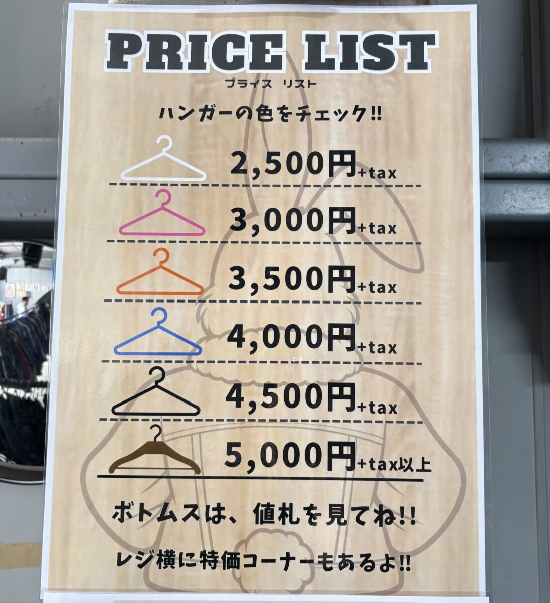 商品はハンガーの色によって6段階に分かれています。