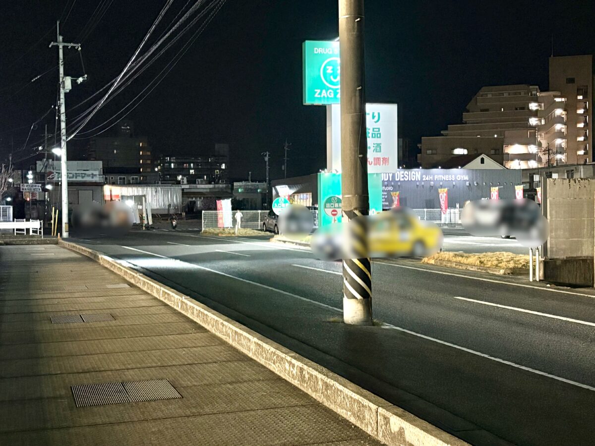左を見ると、「ザグザグ 津高店」、「レシオボディデザイン津高店」、「グランドマート津高店」がある方。