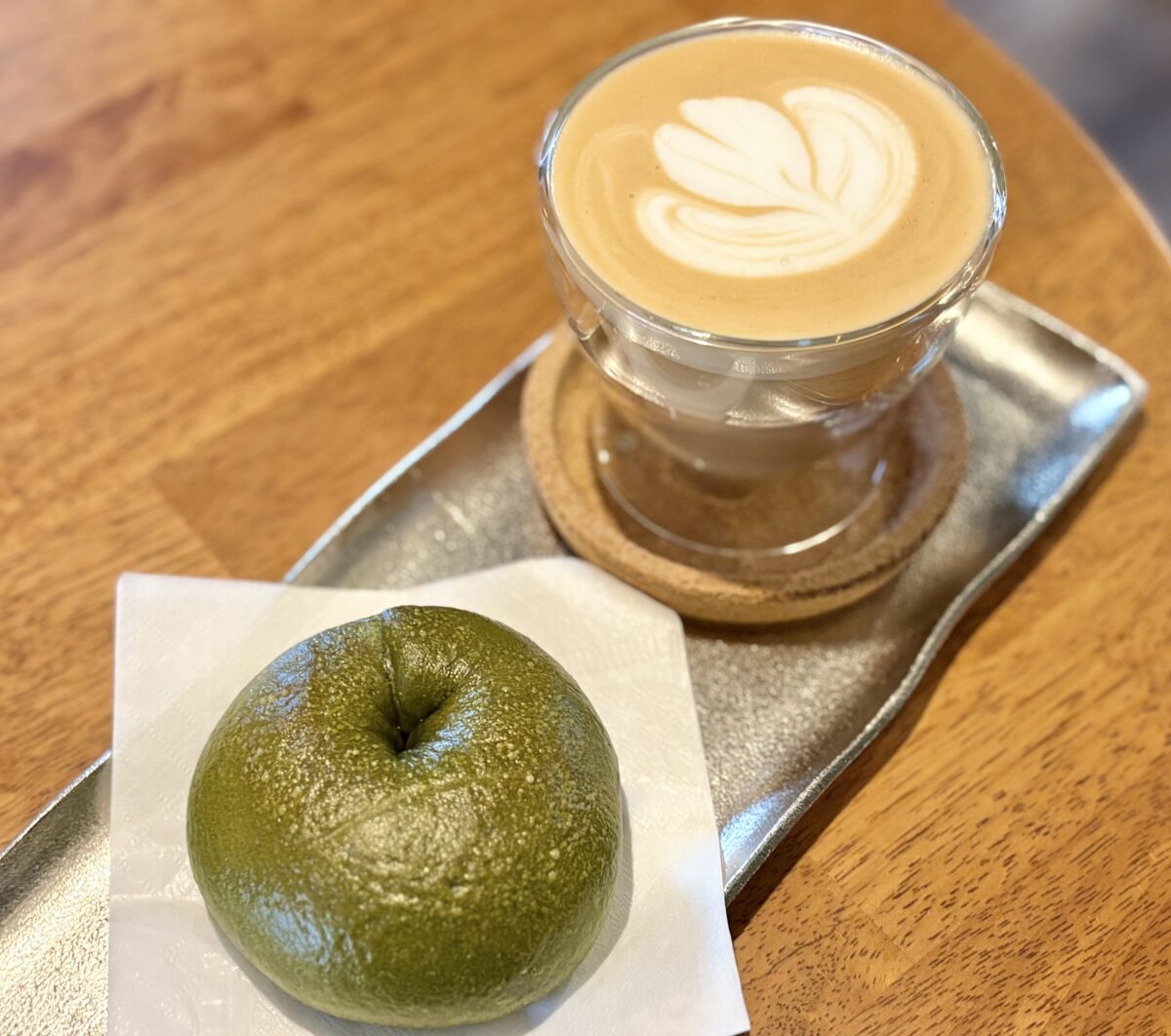 こちら頼んでみた「抹茶もちあんこベーグル」と「カフェラテ」です。