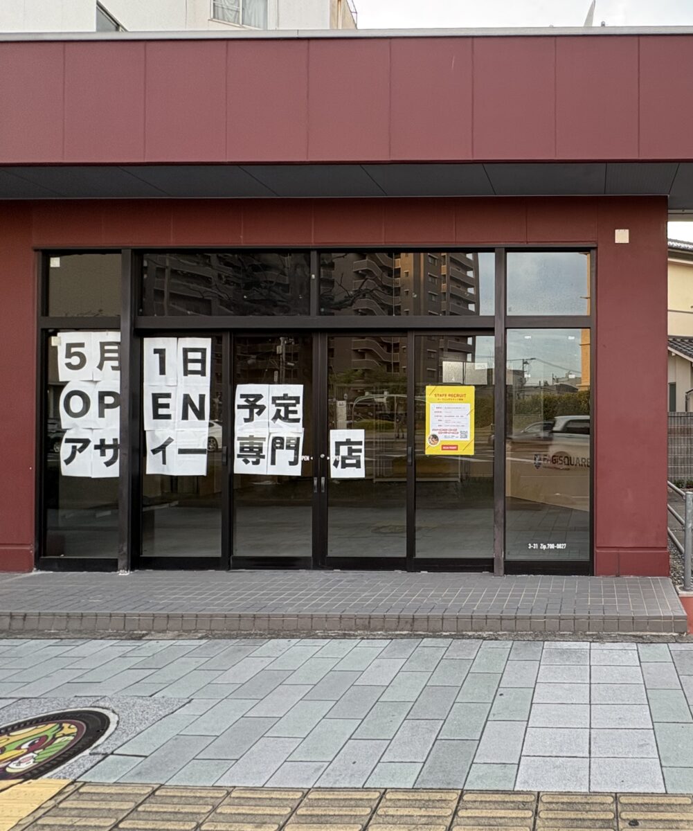 2月末に閉店した「ファジスクエア」の建物に5月1日オープンの貼り紙が貼られています。