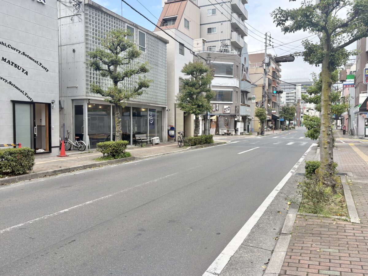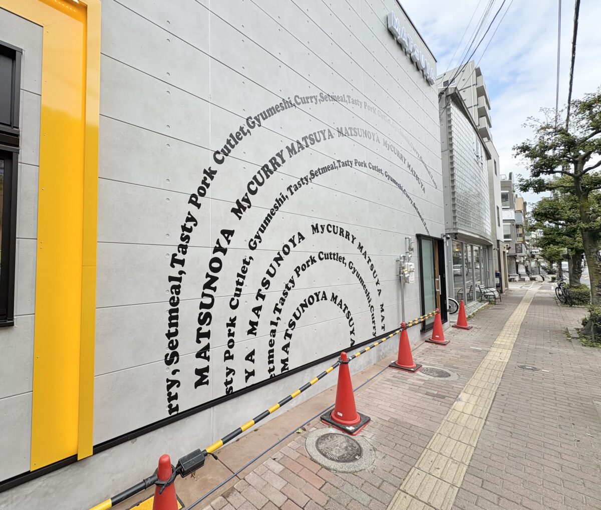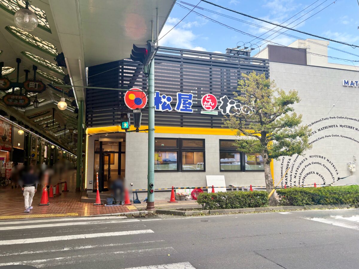 商店街に合わせてか、松屋の黄色と青色を抑えた落ち着いた印象になっていました。