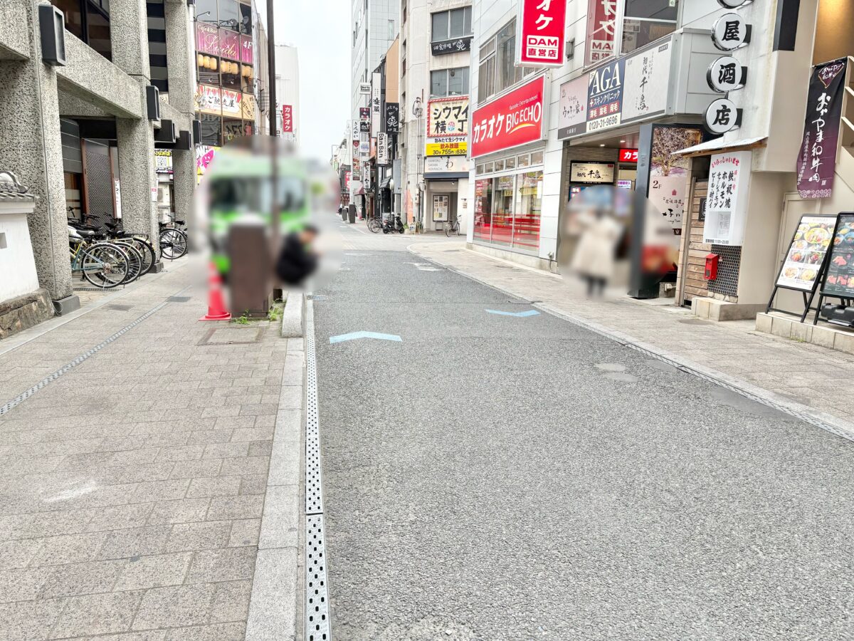 左には「かに道楽 岡山店」、「カラオケ ビッグエコー岡山本町通り店」などがあって岡山駅方面。