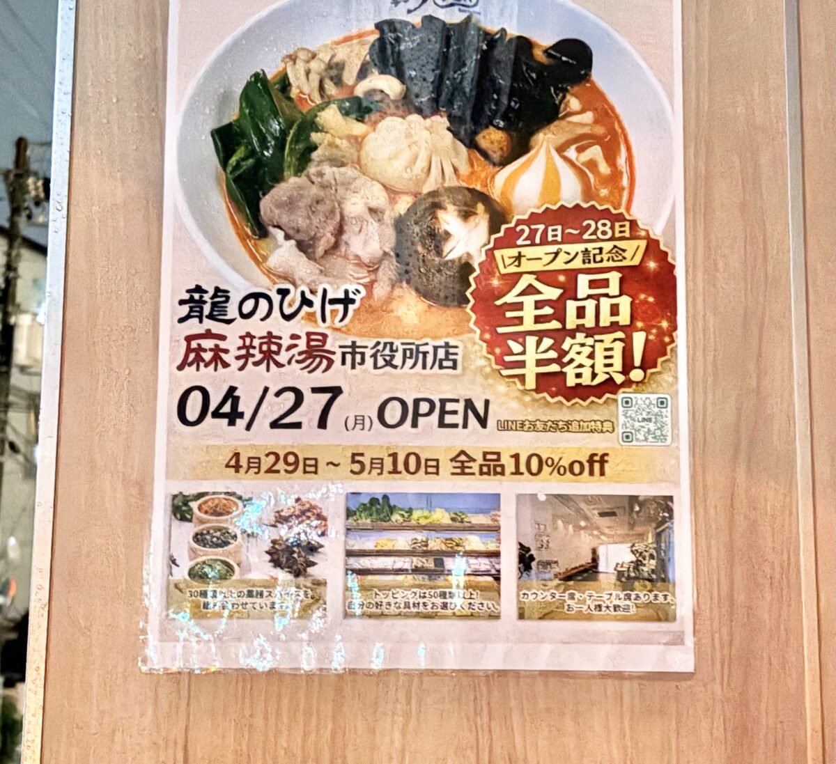 岡大病院ちかくに「龍のひげ麻辣湯 市役所店」さんが4月27日にオープンするようです。