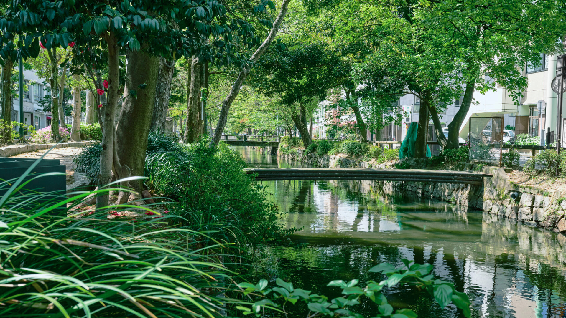 左を見るとこうなってまして、反対側に「岡山市立幸町図書館」や下石井公園までこれくらいの距離感になっています。