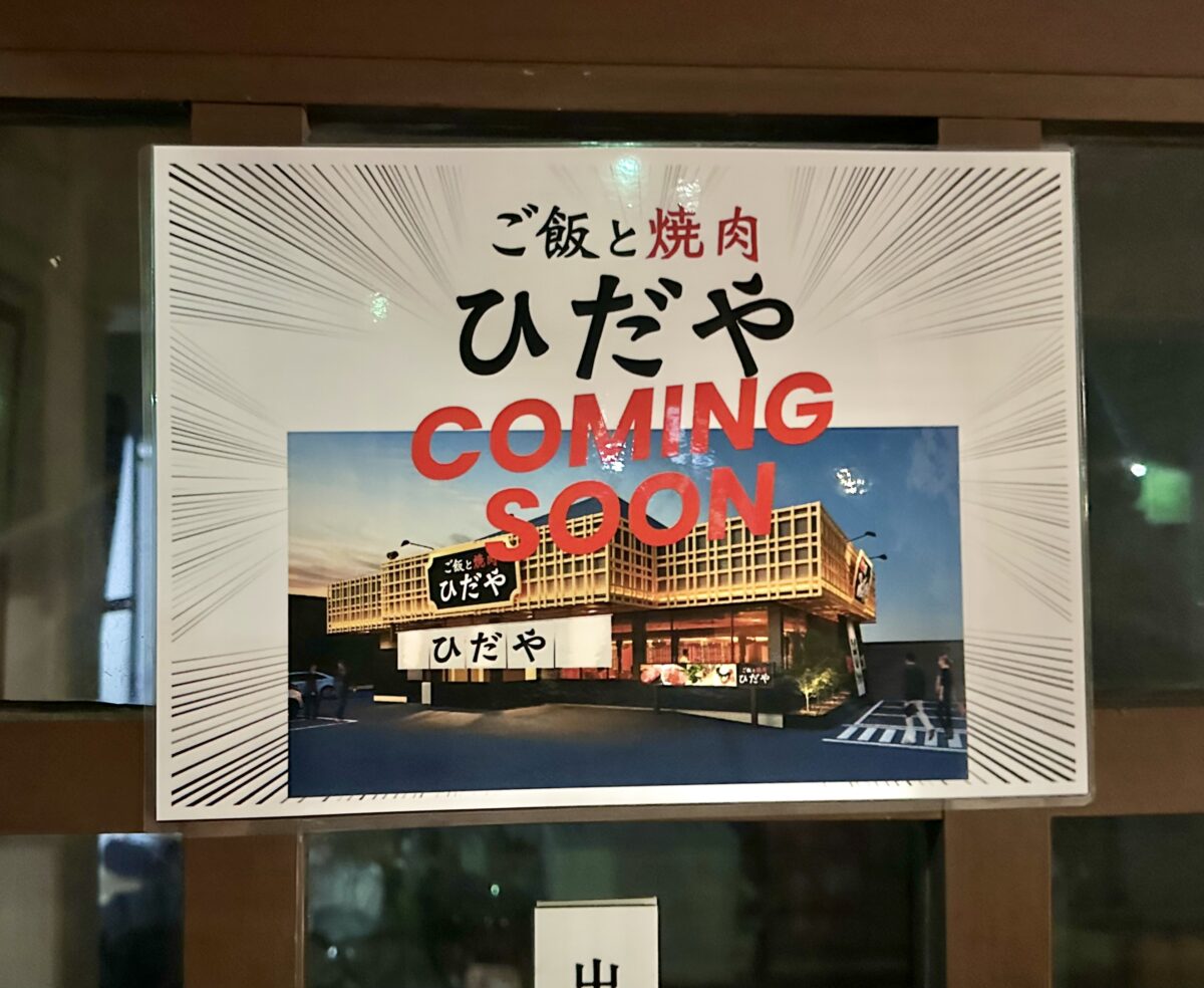 「ご飯と焼肉ひだや COMINGSOON」となっていました。