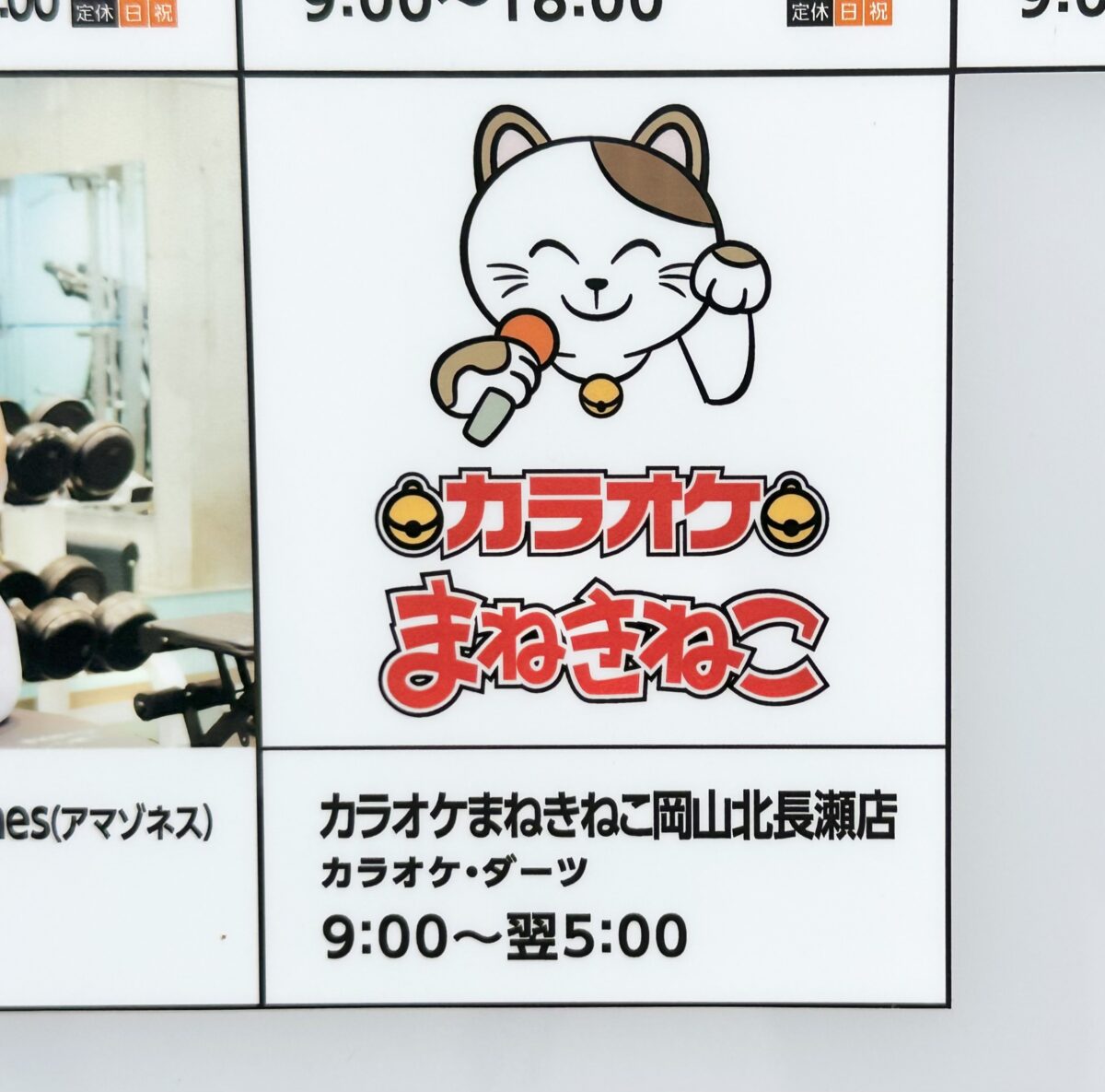 案内板によると「カラオケまねきねこ岡山北長瀬店」、カラオケ・ダーツができるようで営業時間が9:00から翌5:00。