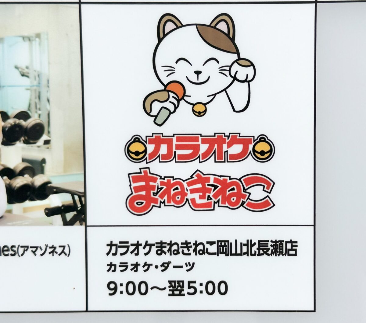 案内板によると「カラオケまねきねこ岡山北長瀬店」、カラオケ・ダーツができるようで営業時間が9:00から翌5:00。