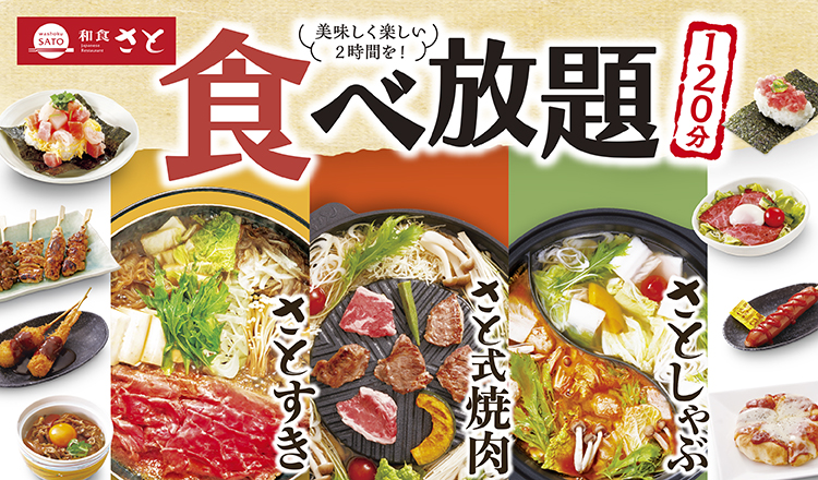 和食さとは焼肉、しゃぶしゃぶ、すき焼きを中心とした食べ放題メニューや季節ごとの和膳も楽しめるファミリーレストラン。