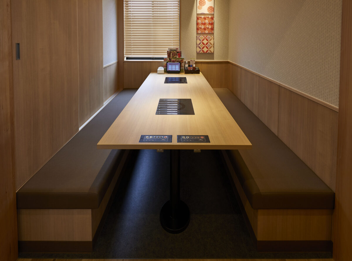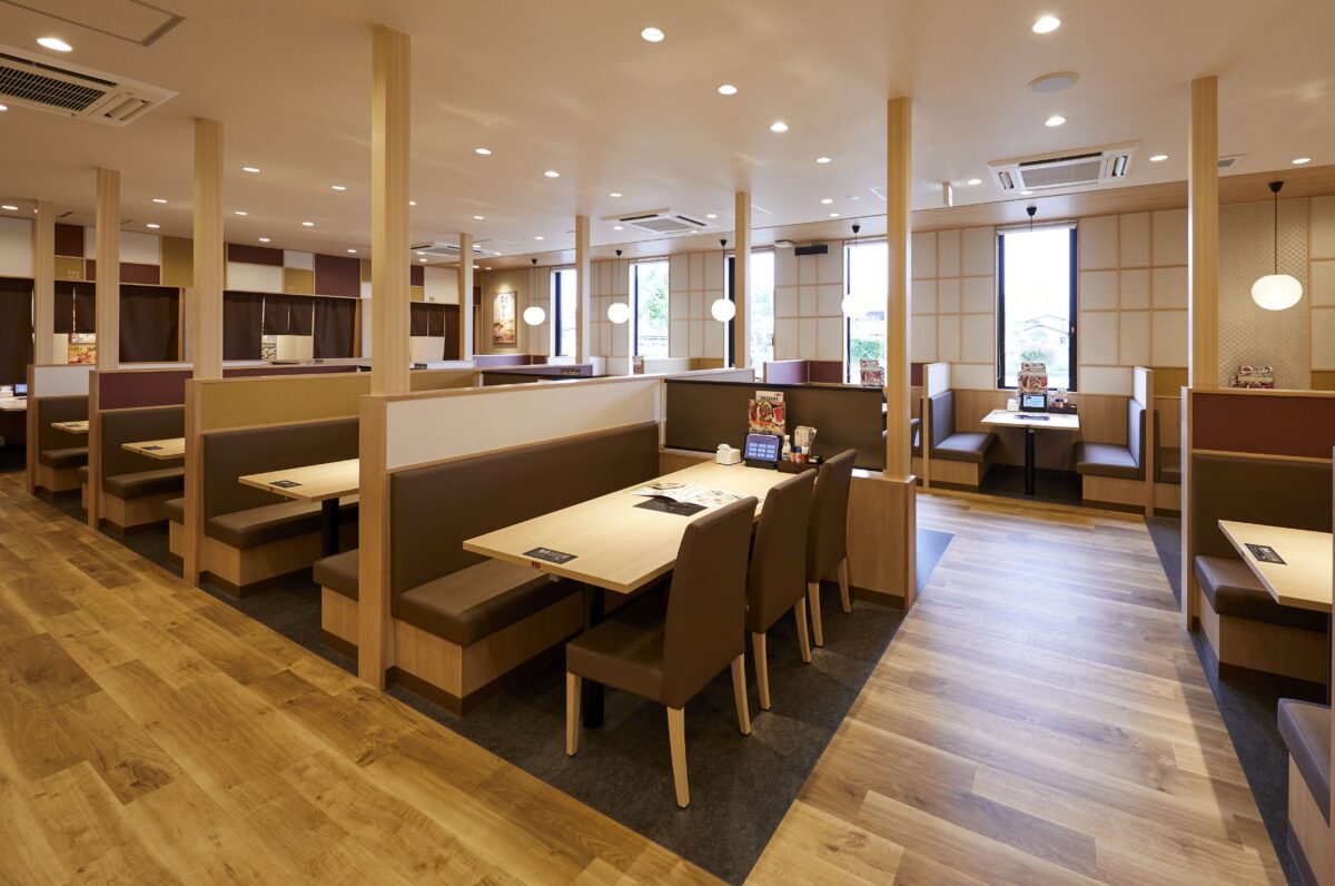 店内は開放感のあるフロア席と家族やグループ用の半個室席があります。