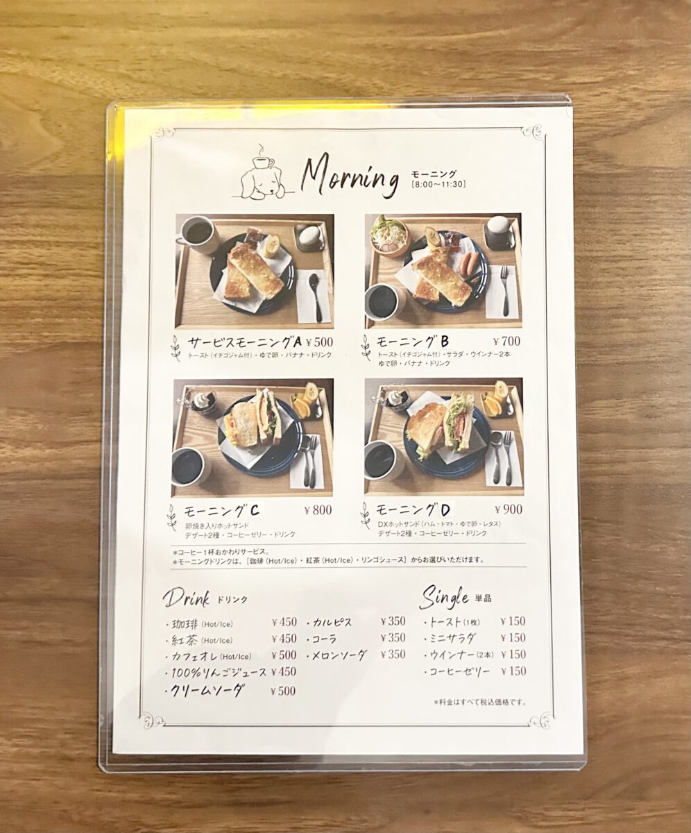 モーニングは4種類、ランチは日替わりランチと気まぐれランチ、それにドリンクにはレトロな雰囲気にぴったりなクリームソーダなども!