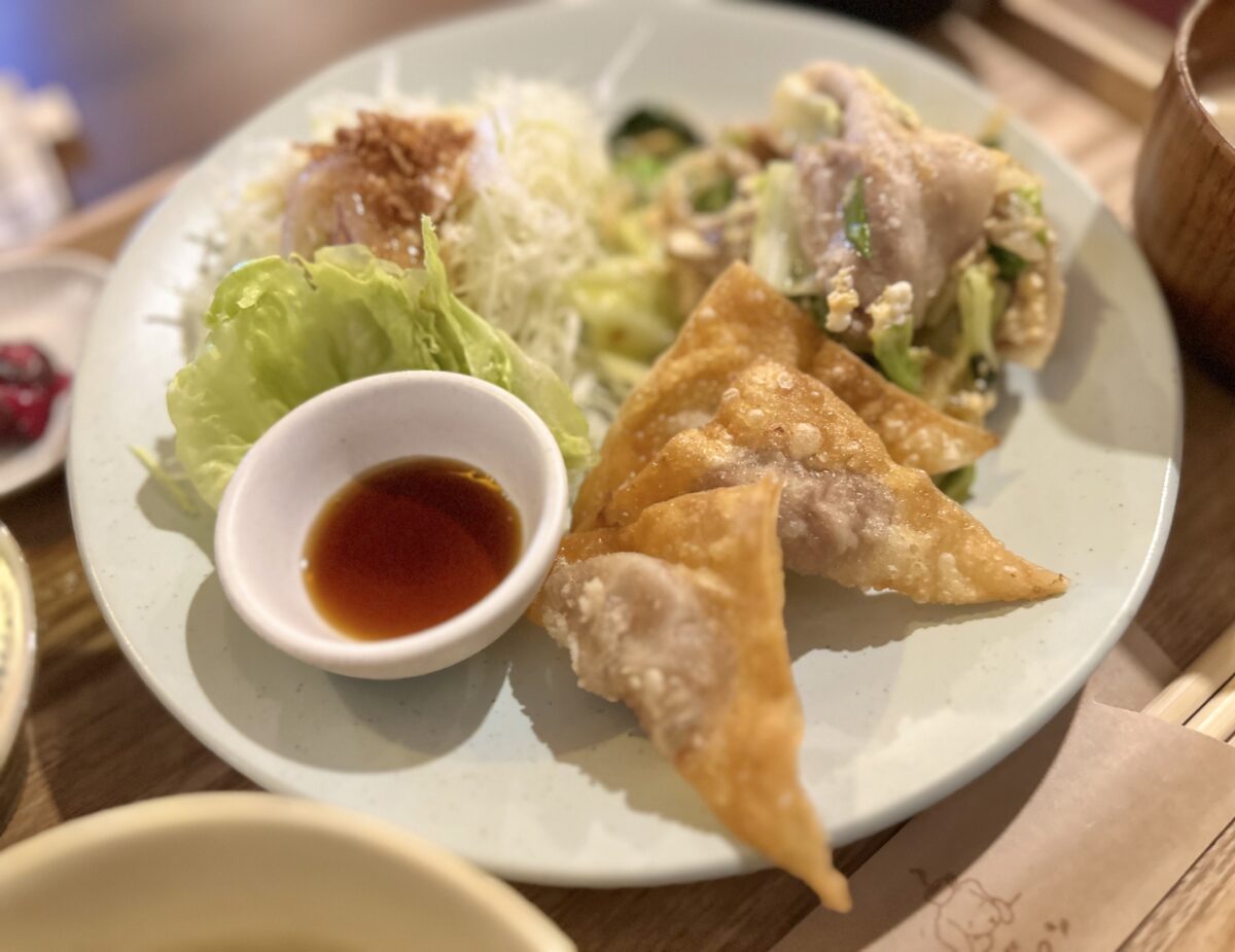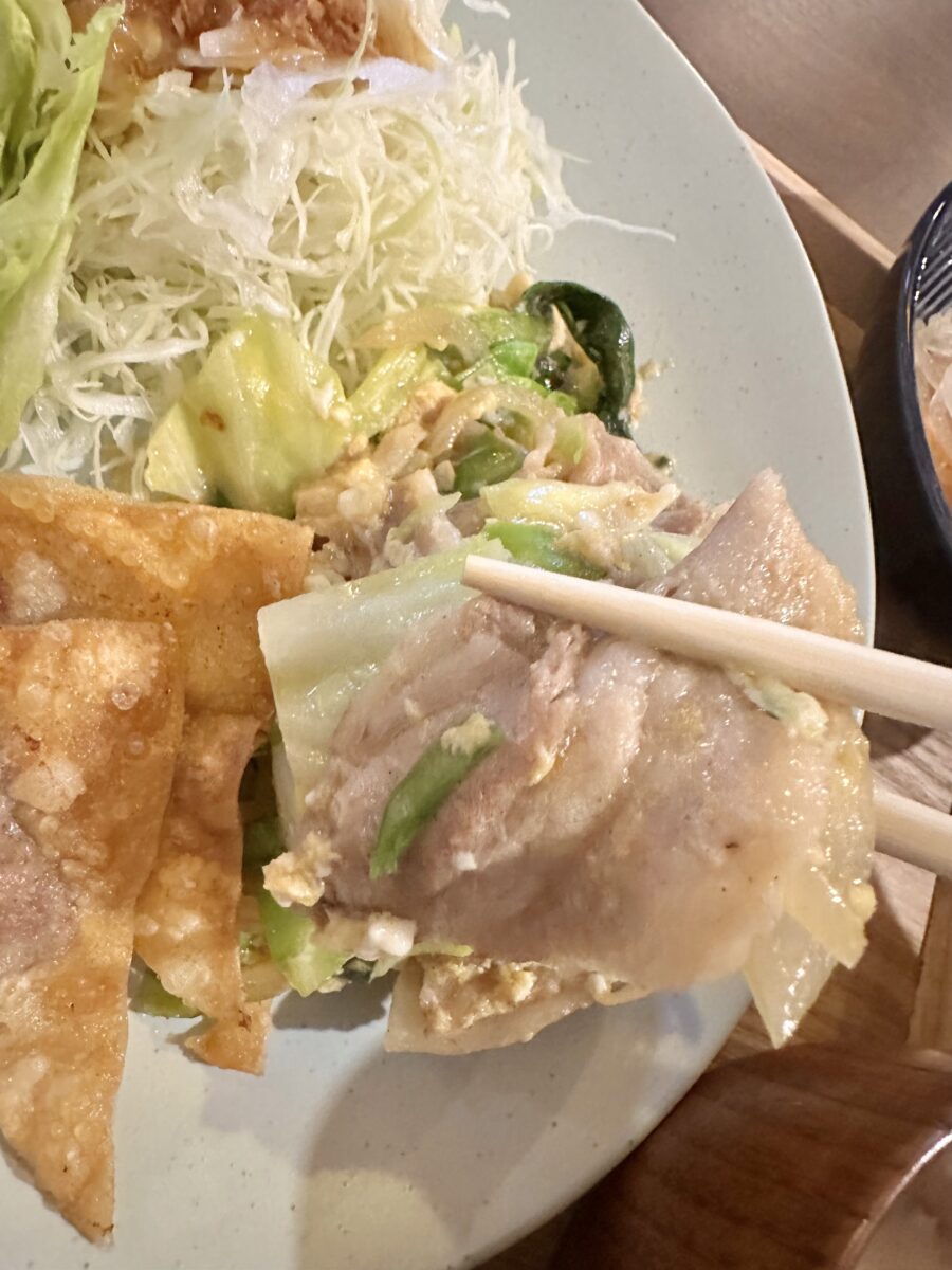 メインにはパリッパリの三角揚げシュウマイ、それに豚ロースとキャベツの中華風炒め。