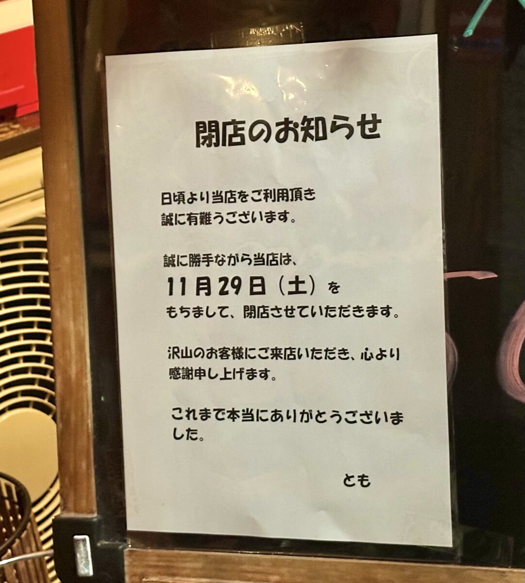 お店の前のお知らせによると、11月29日(土)をもって閉店とありました。