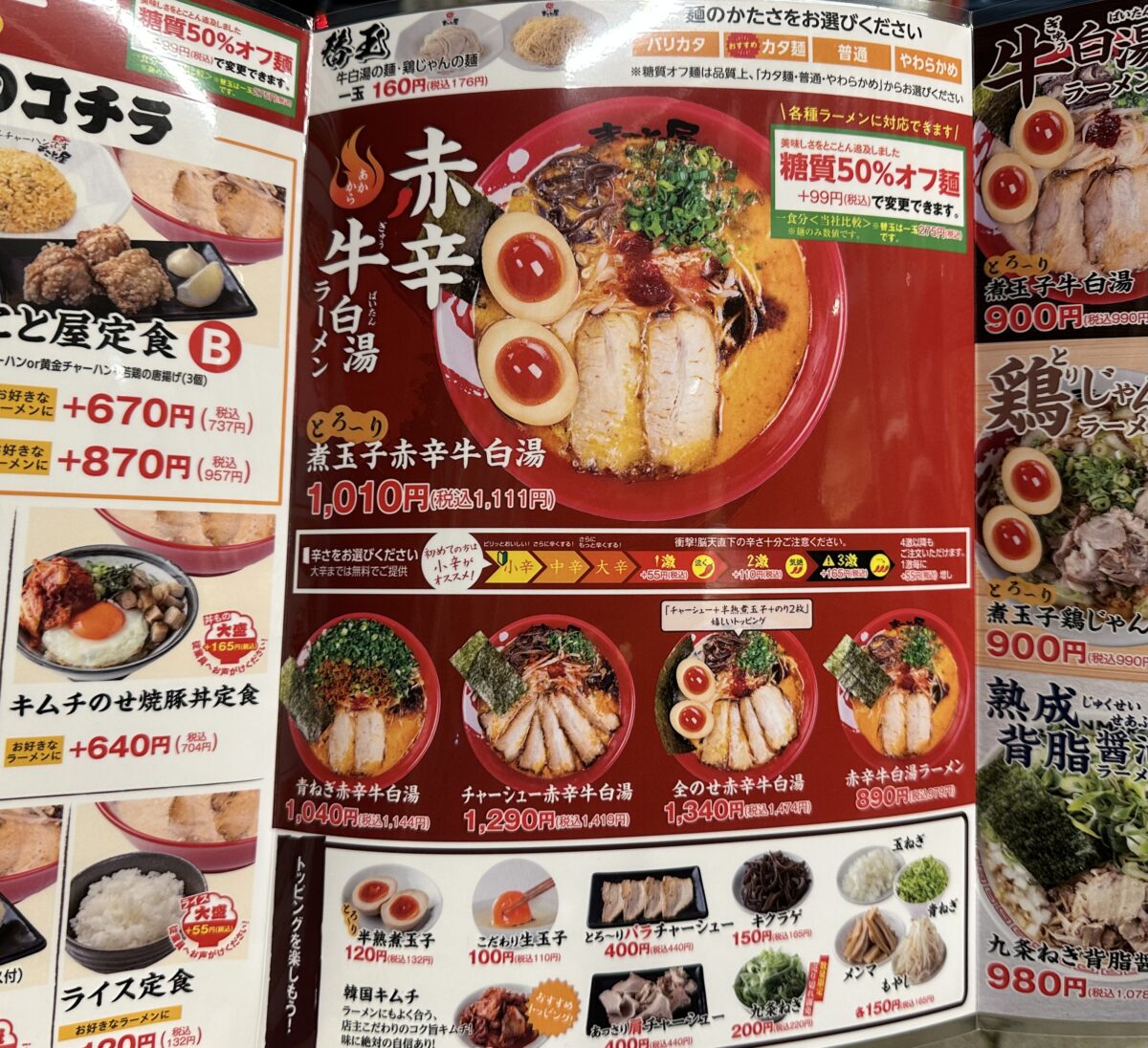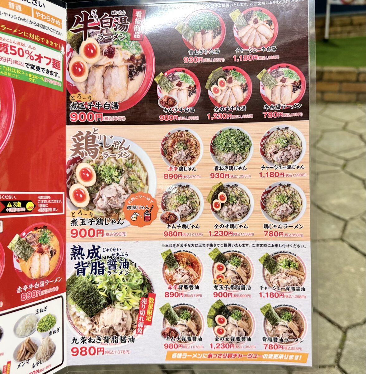 名物「牛白湯ラーメン」をはじめ、鶏じゃんラーメン、熟成背脂醤油ラーメンなどあっさり系もこってり系もある模様。