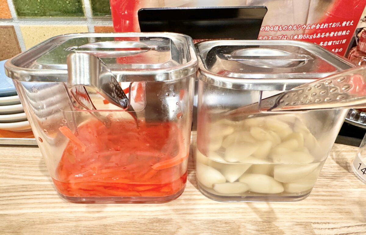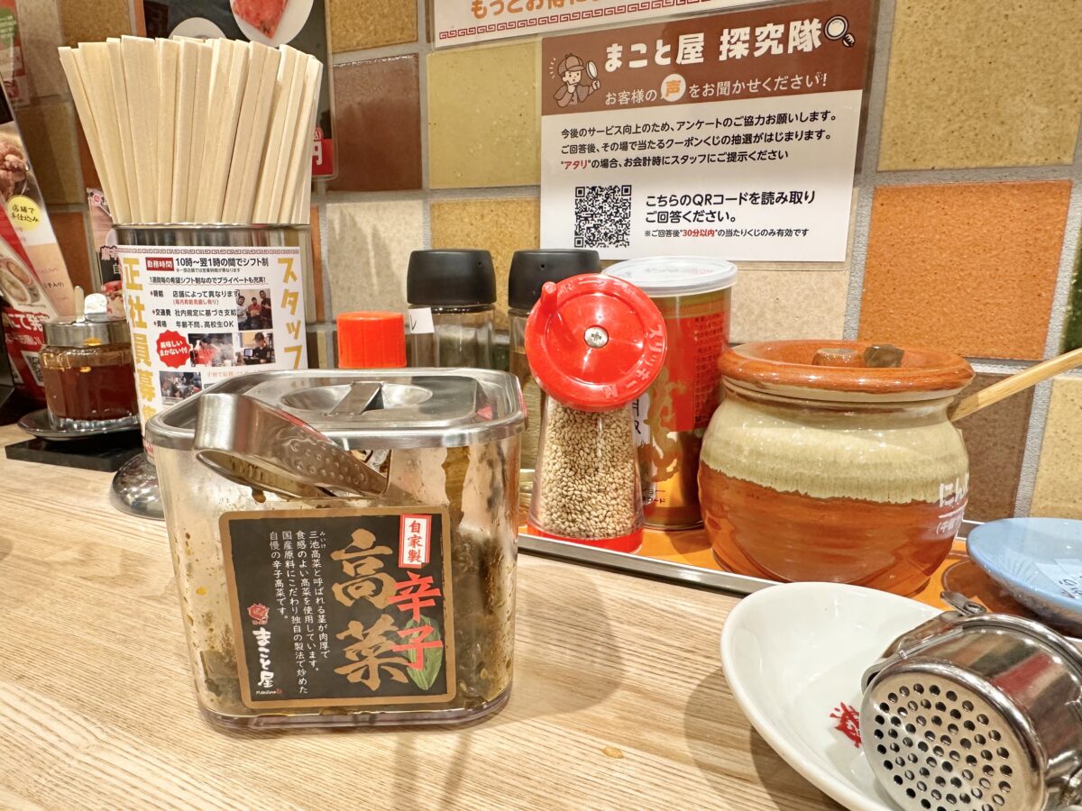卓上調味料がいっぱいありまして、辛子高菜で辛味やパンチを効かせたい時には生ニンニクなどあります。