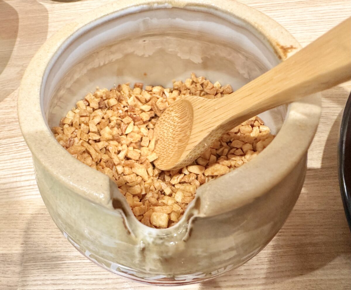 今回はニンニクチップをちょっとだけ入れてみるだけで、おにさんぽ中の人好みのハーモニーを形成することができました。