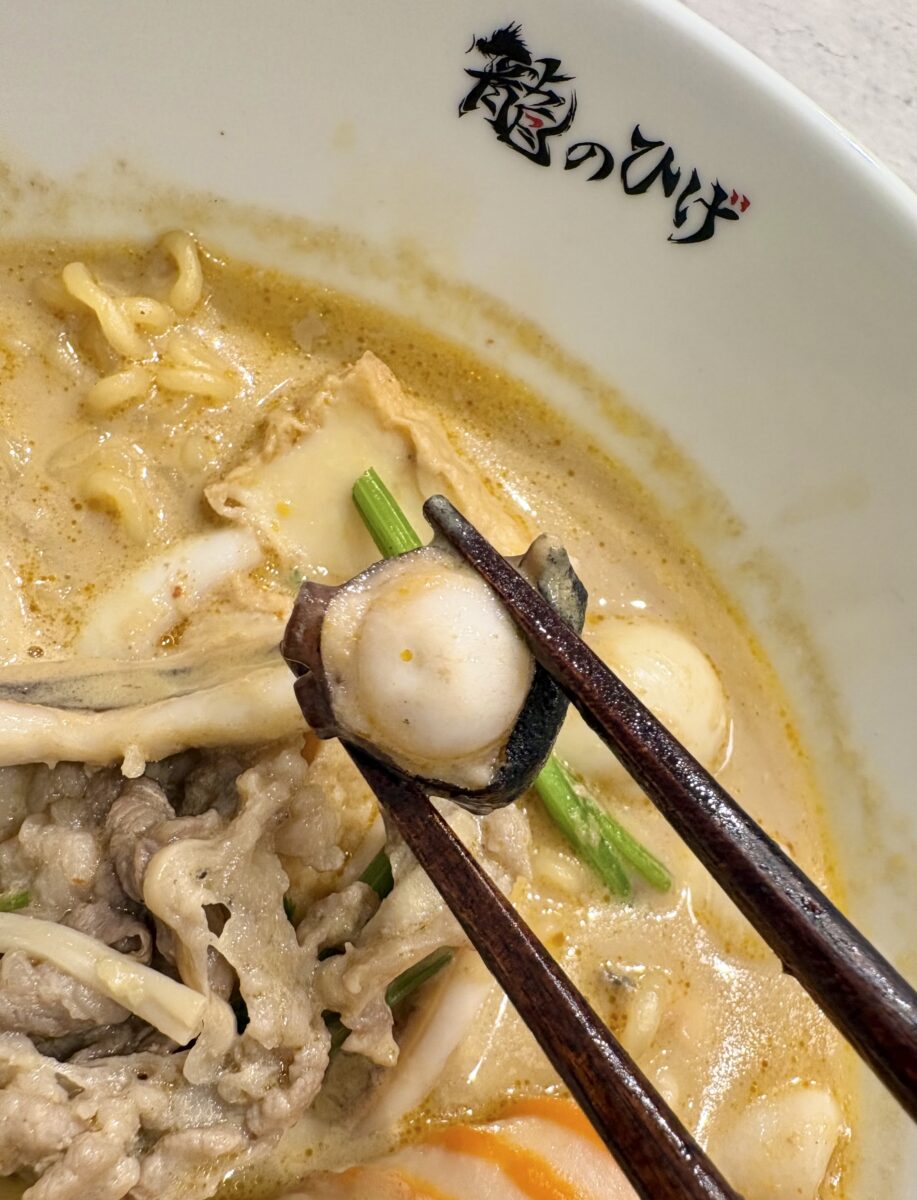 具材は牛肉、うずらの卵、スイートコーン、えのきだけ、タコ、イカ、春菊に練り物など全部で10種類程度。