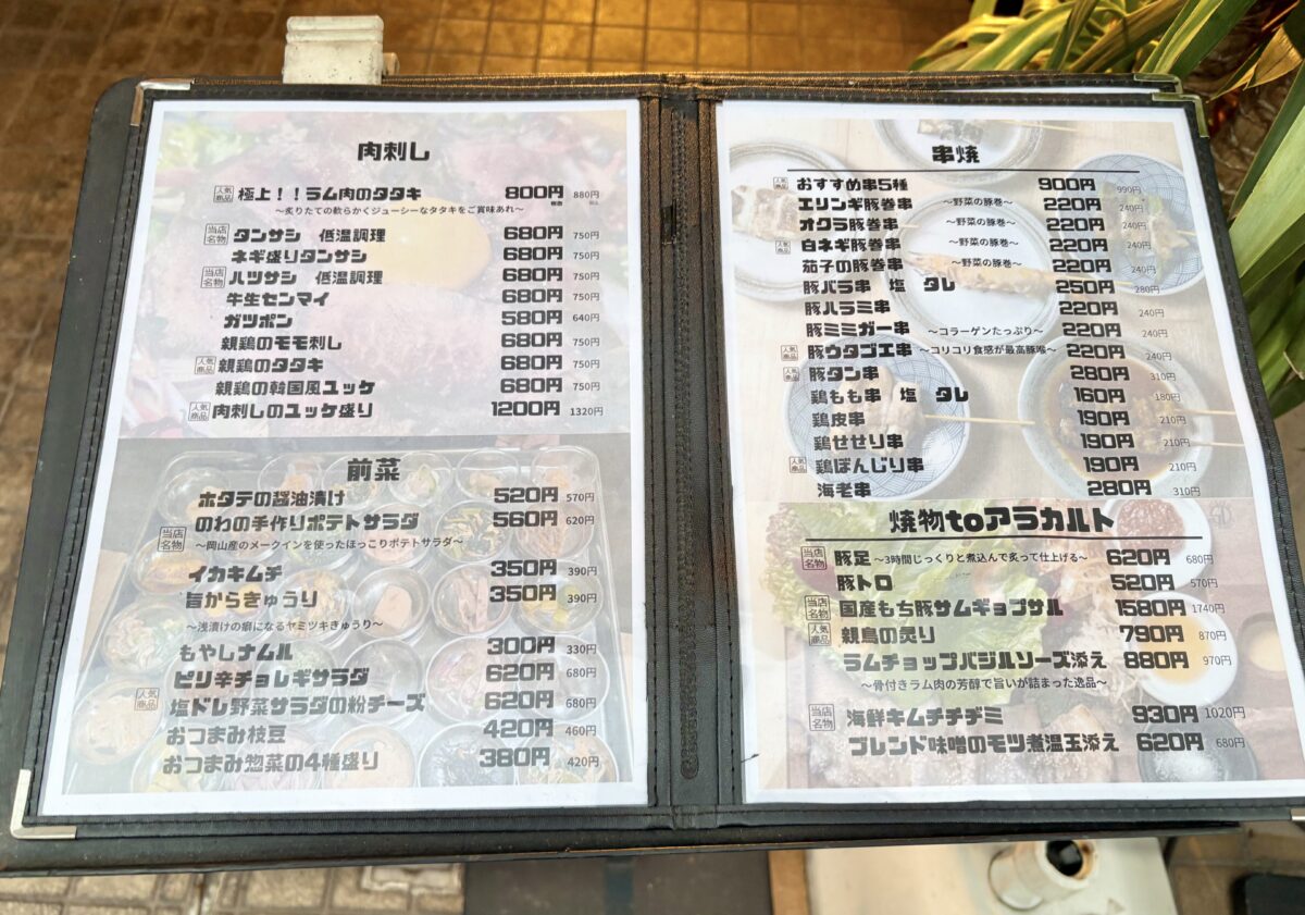 夜は肉刺し、串焼き、焼物、アラカルトと幅広いメニューが楽しめるようになっていました。