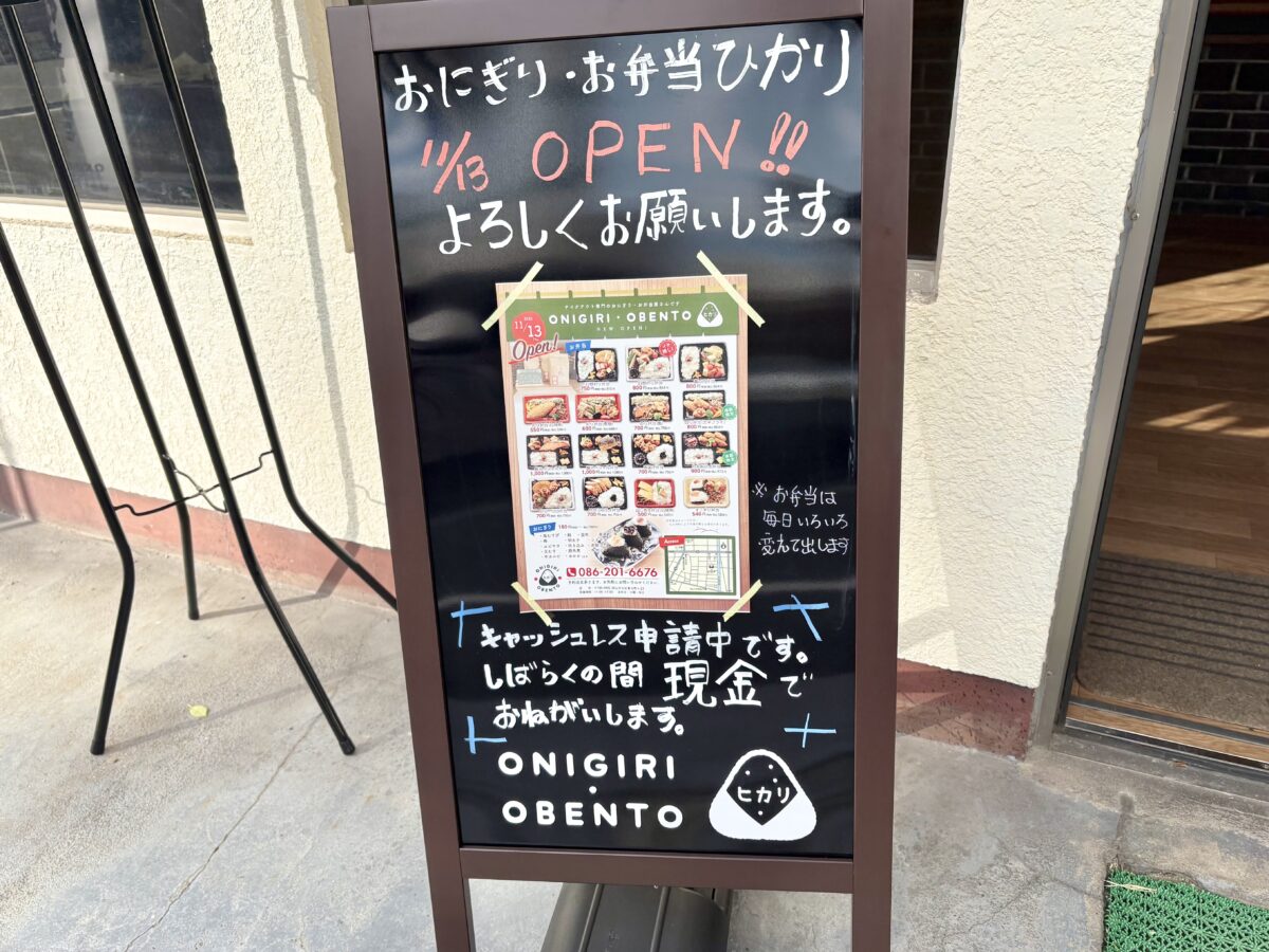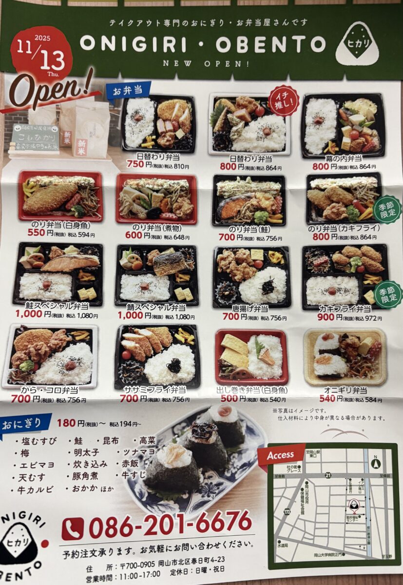 岡山市役所近くの春日町に「ONIGIRI・OBENTO ヒカリ」さんというおにぎりとお弁当のテイクアウト専門店ができてました。