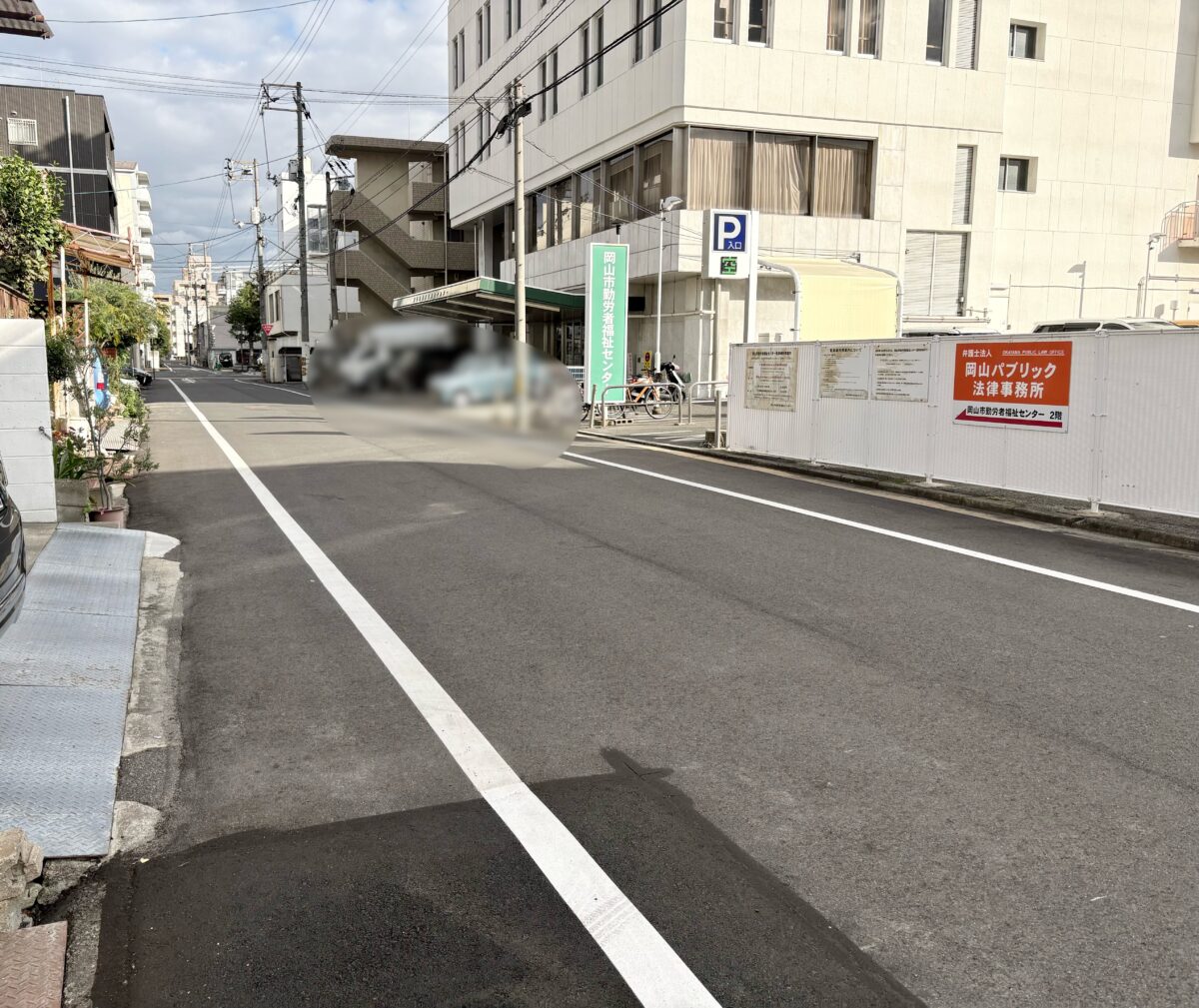 「岡山市 保健福祉局勤労者福祉センター」があって、枝川緑道公園の枝川橋が見えます。