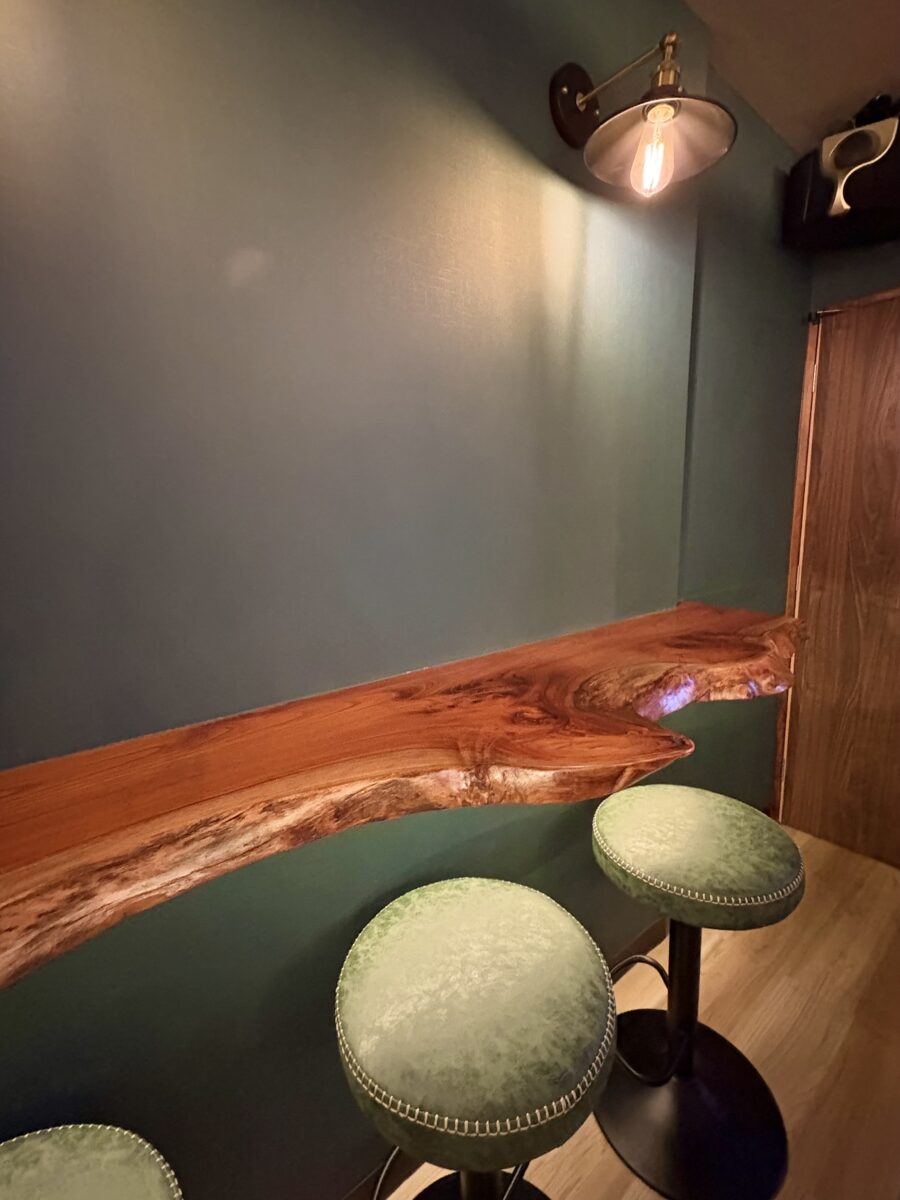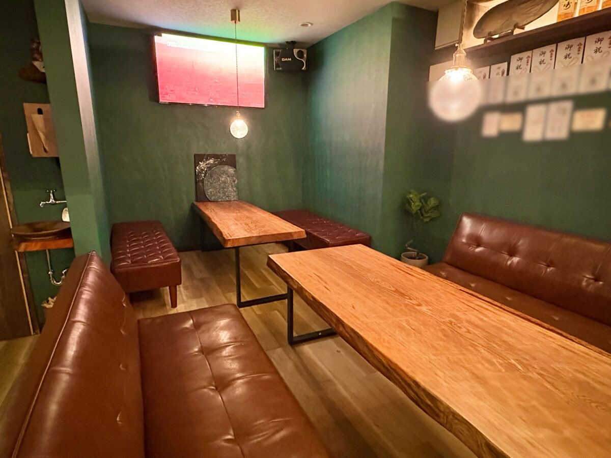 カウンターにソファ席があって、最大20名が入れる店内です。