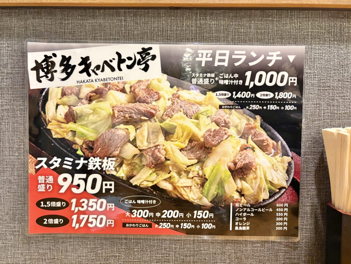 お酒もあるんでスタミナ鉄板をつまみにするのもよさそうです。博多の味を体験してみては!