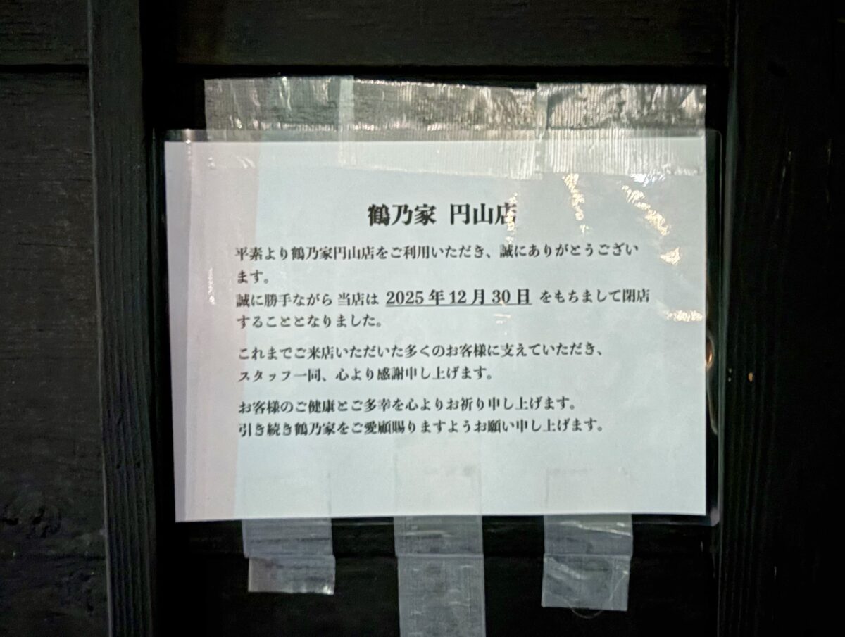 富山小学校近くにある横浜家系ラーメン「鶴乃家 円山店」が閉店するそうです。