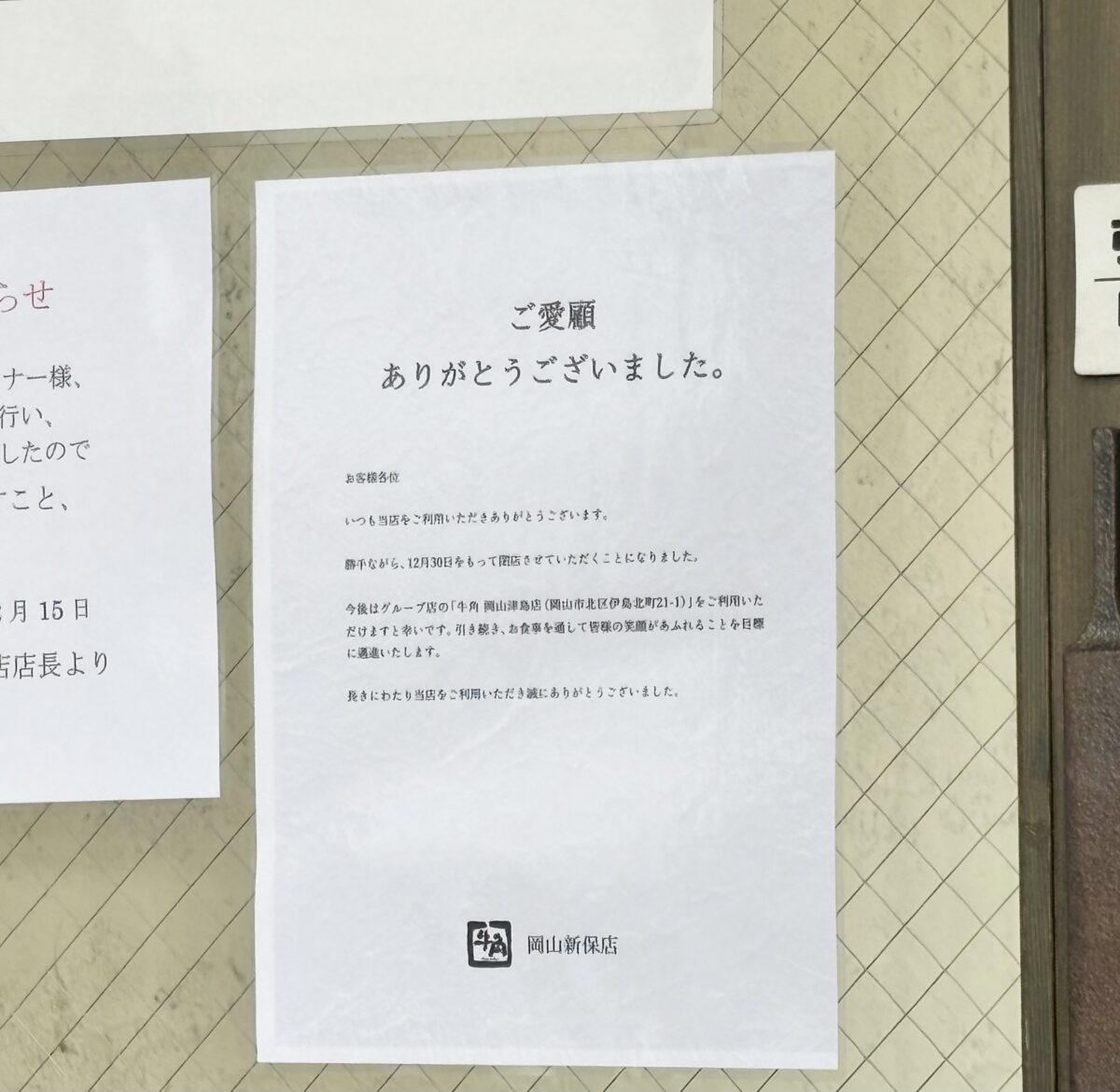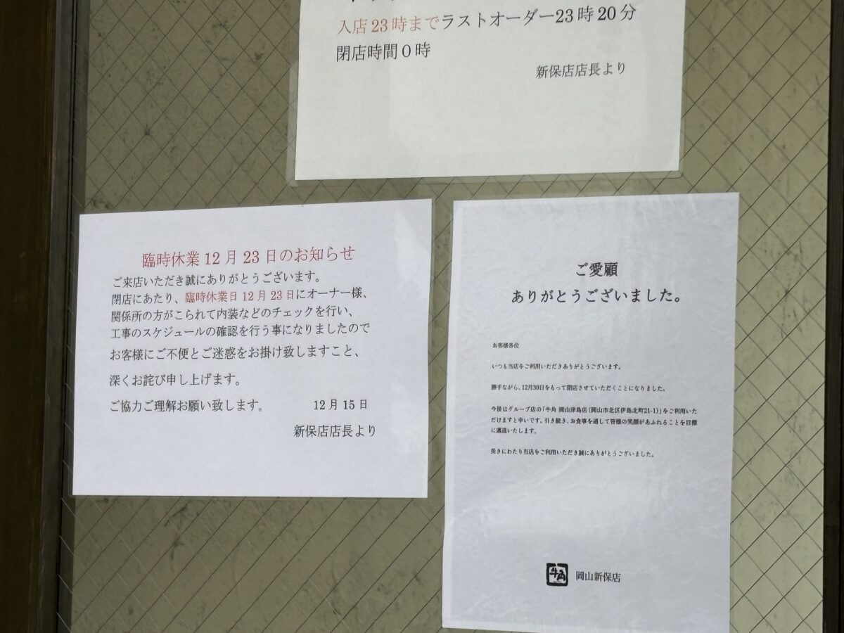 「牛角岡山新保店」が12月30日で閉店するようです。