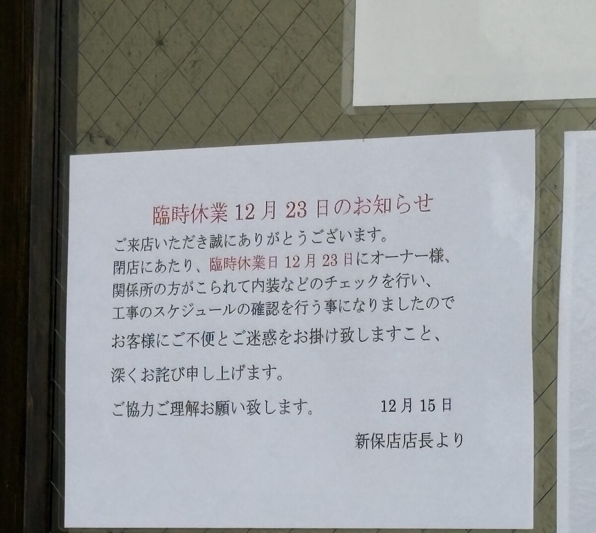 横には12月23日臨時休業のお知らせも。