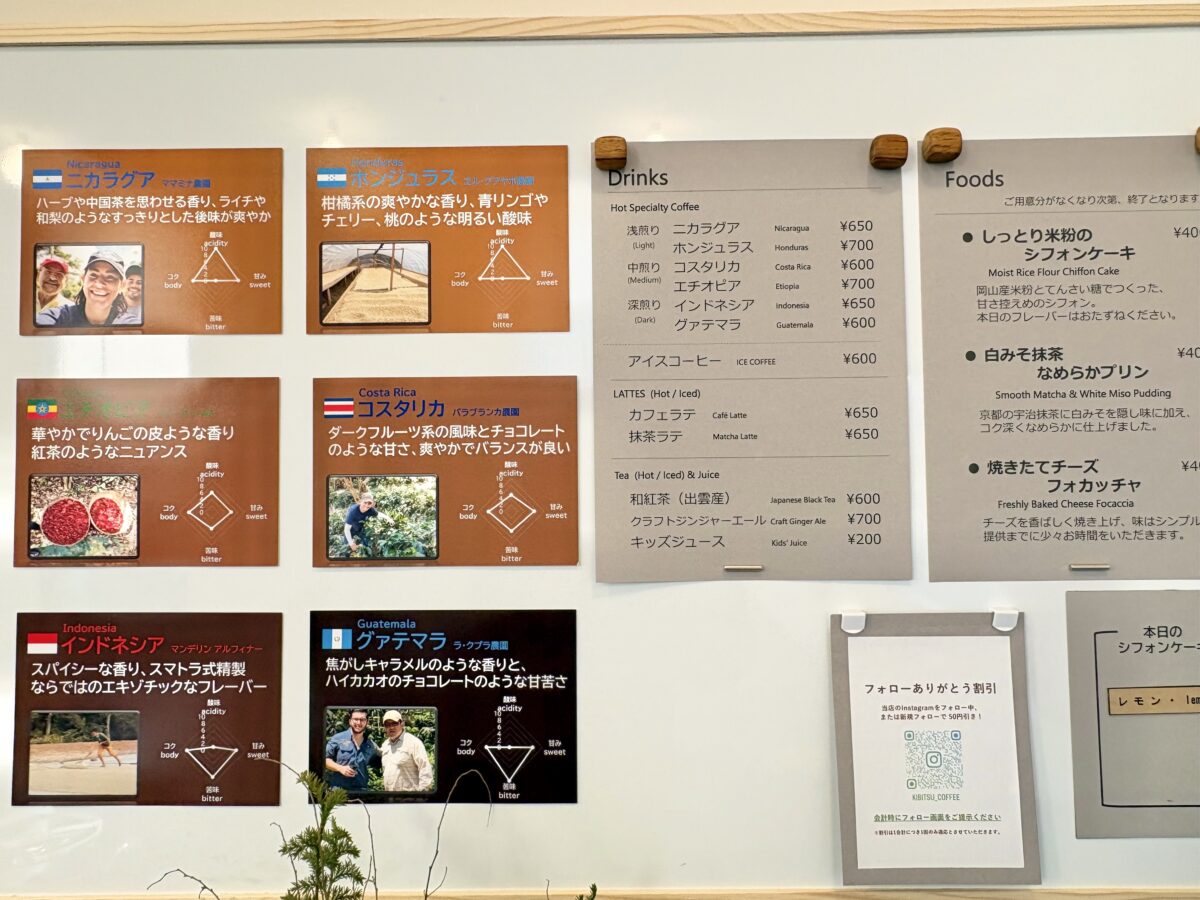 メニューにはニカラグア、ホンジュラス、コスタリカ、エチオピア、インドネシア、グァテマラなど選び抜かれたコーヒー豆のコーヒー。